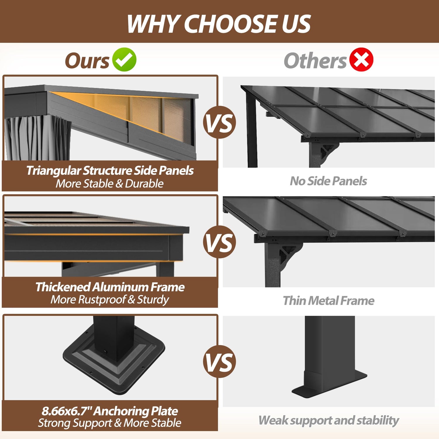- Sloping Polycarbonate Roof: The slope roof design allows for quick drainage and prevents rainwater from gathering. The hardtop gazebo with polycarbonate roof not only offers ample shade but also help to harmful UV rays.It's the perfect addition to your patio, garden or backyard.
