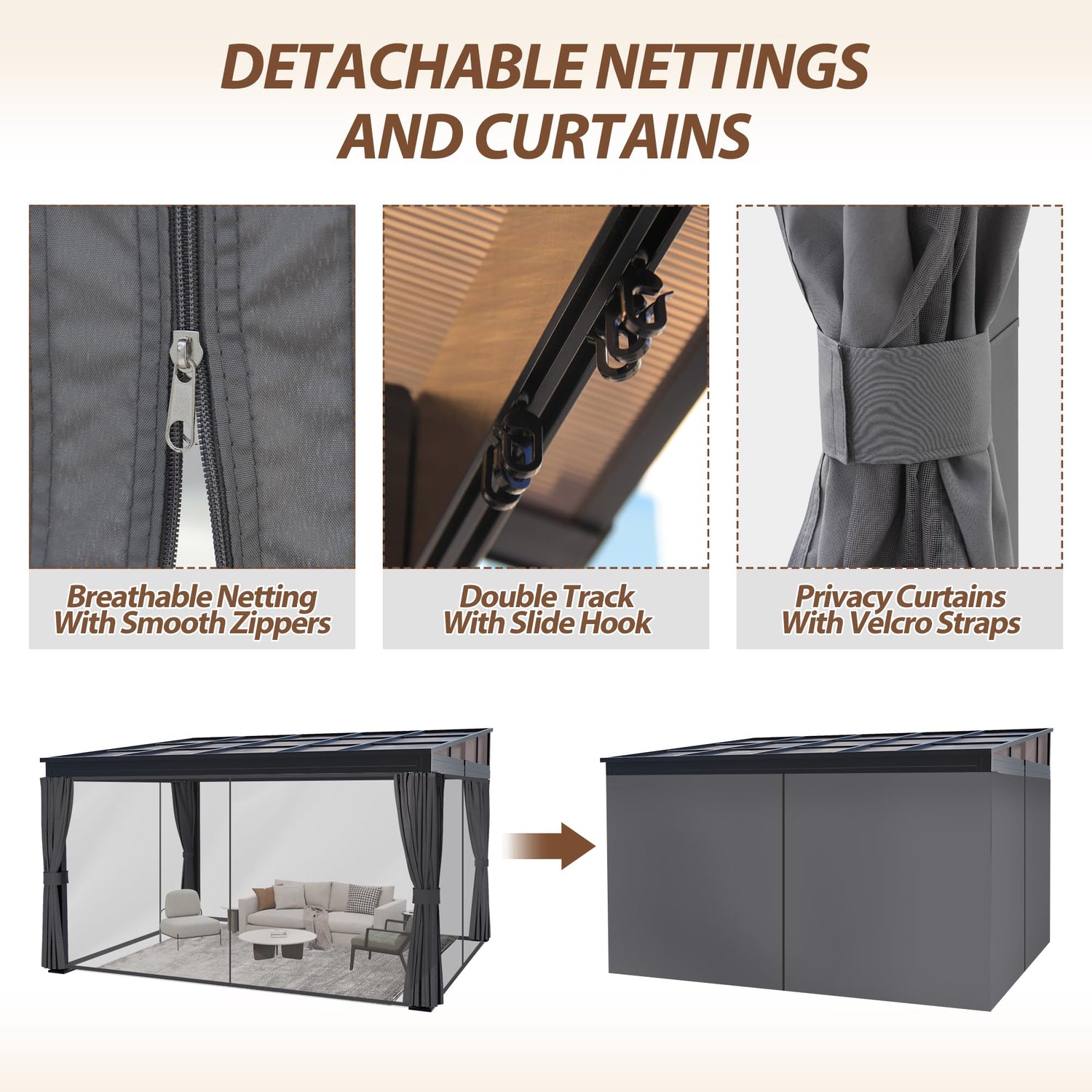 - Good Ventilation & Protect Privacy: The lean to gazebo comes with detachable nettings and curtains, which can maintain good ventilation and provide added privacy , allowing you to enjoy the outdoors with your family.