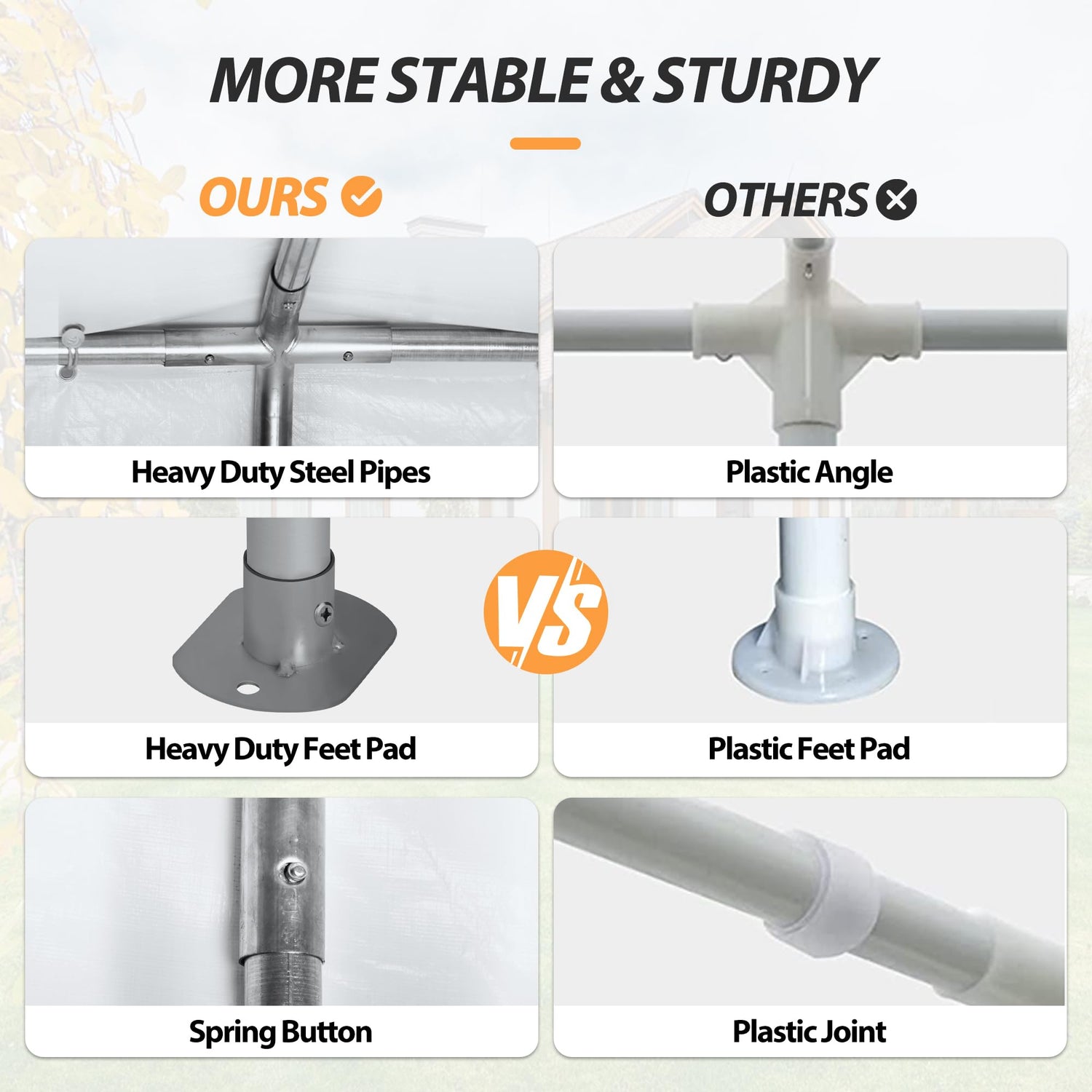 - UPGRADED GALVANIZED FRAME: The party tent is made of premium powder coated galvanized steel that is rustproof, built to last and will not deform easily, making it perfect for outdoor use.