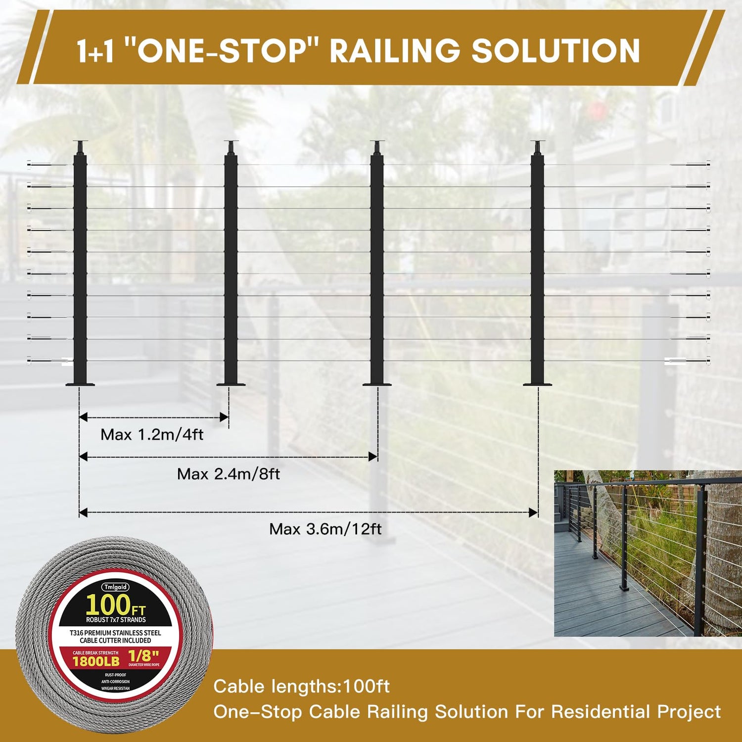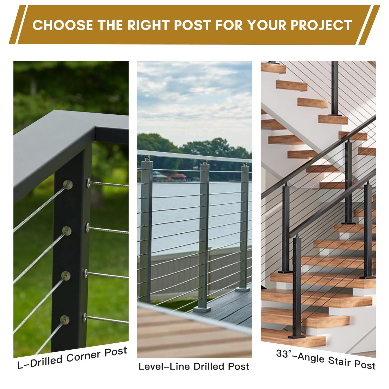 - High quality material: This cable railing post is made of high-quality T304 stainless steel, which has strong rust resistance. The widely used 1/8-inch silver railing cables and terminals are made of T316 marine grade steel, making them ideal for indoor and outdoor applications such as decks, stairs, porches, balconies, and fences.
