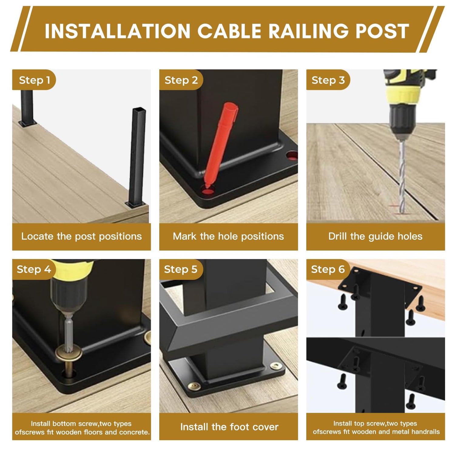 - The set includes:Stair Post x2, Post Foot Cover x2, Cable Grommets x48, For wood floor x8, For concrete floor x8, M5*20mm screw for wood handrails x8, M5*16mm screw for metal handrails x8, Allen Wrench x1, Invisible Cable Railing Kit x24, 1/8" T316 Wire Rope Cable x100FT, Cable Cutter x1, User guide.