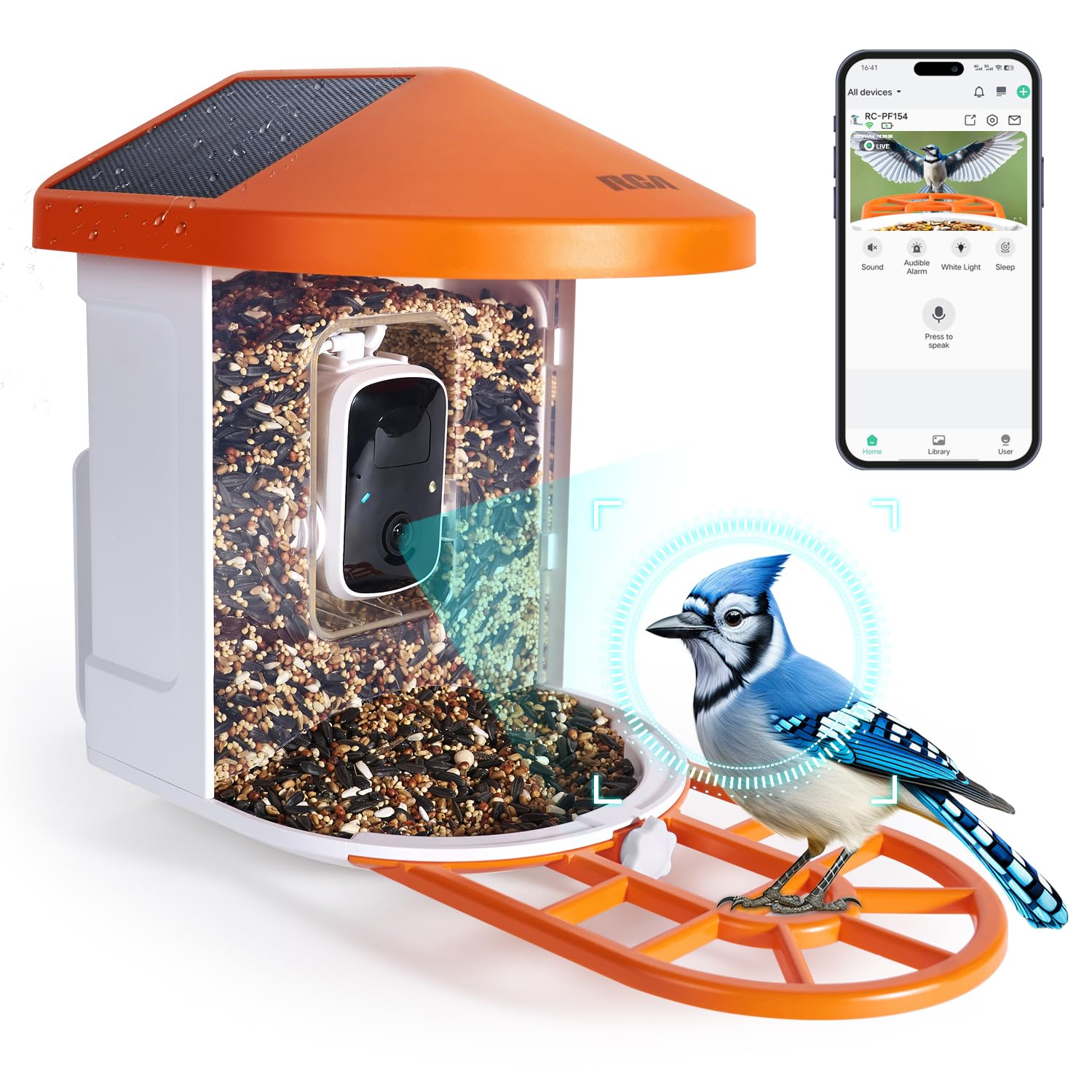RCA Smart Bird Feeder with HD Camera – AI Bird Recognition Technology, Infrared Night Vision, Solar Powered, Two-Way Audio, Waterproof/Dustproof, WiFi-Enabled, Cloud Storage, App-Control