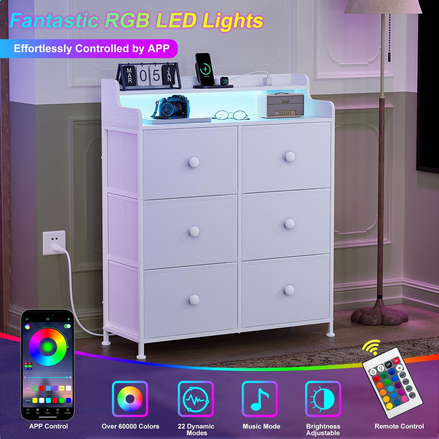 - Unique Design: REAHOME dresser Equipped with a built-in power outlet and LED light, this dresser combines functionality and style. Built-in power outlets (2AC+2USB+1TC), allowing you to easily charge your devices without the need for extra extension cords. With over 60,000 DIY colors to choose from, allows you to control 21 dynamic modes, 8 speed modes, and 8 brightness modes. follow your mood meet your needs