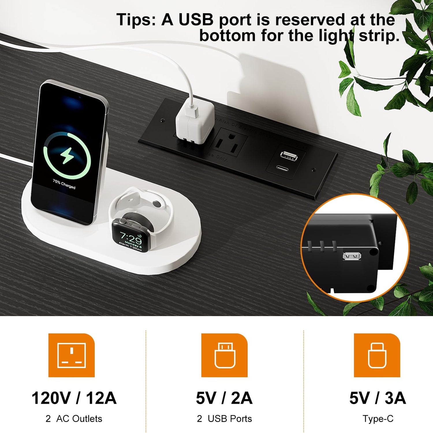 - 55” Dresser TV Stand with Charging Station: The charging station is equipped with 2 standard plug sockets, 2 USB ports, 1 Type-C and a 4.9-foot power cord. Multiple devices such as mobile phones, headphones, watches, computers, etc. can be charged at the same time