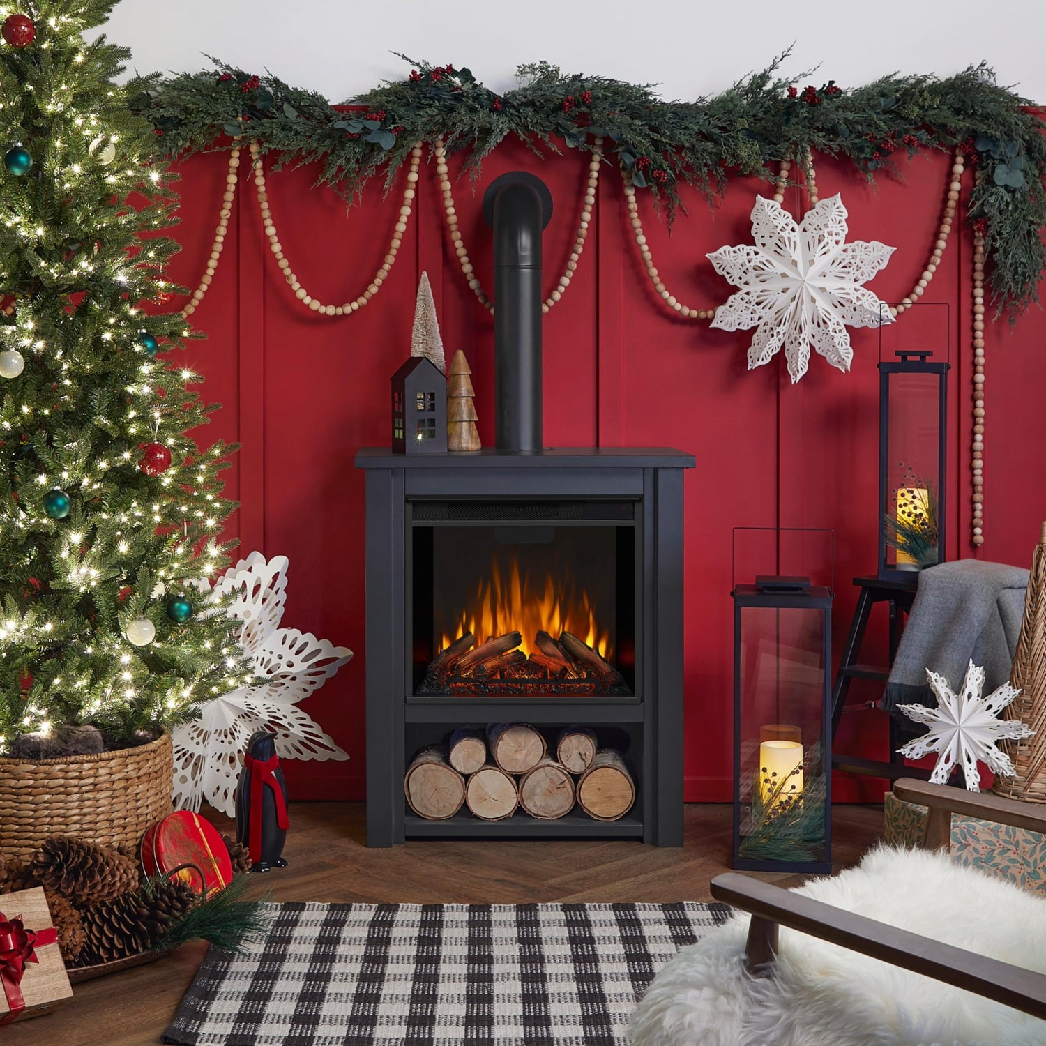 Details: Perfectly suited for many environments, the Hollis Electric Fireplace is designed to replicate the look of a built-in wood stove. A compact footprint allows practically endless placement options, even in small spaces. Complete the look by attaching the included stove pipe and using the storage compartment to display split logs. The Vivid Flame Electric firebox plugs into any standards outlet, and includes features such as a programmable thermostat to provide precise heating with 6 preset temperature settings in Celsius or Fahrenheit, timed shut off, dynamic embers, capacitive touch controls, and multiple flame color options. Available in matte black and matte white.