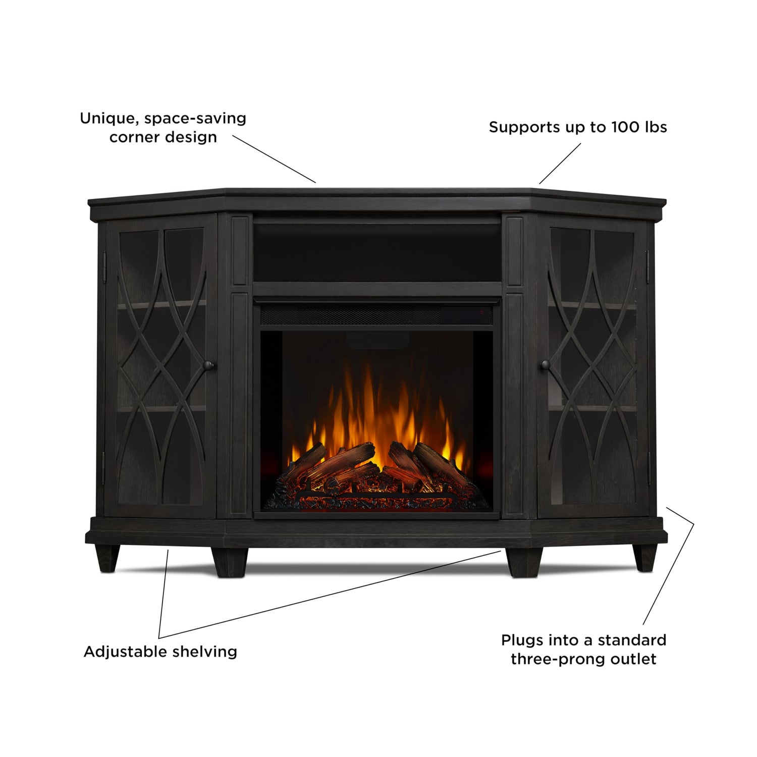 Details: Add a functional, modern centerpiece to any room in your home with the Lynette Corner Fireplace TV Stand by Real Flame This electric fireplace with mantel can support up to 100 pounds and features a 1500 Watt fireplace heater with a heat output of 4,780 BTUs. Designed to provide supplemental heat for up to 1000 square feet, these electronic fireplaces are perfect for indoor living rooms, family rooms, bedrooms, and more With a beautiful grey wooden finish, this faux fireplace heater has a fresh, modern design with elegant glass and mullion doors. It includes functional, adjustable storage shelves, and a Vivid Flame Electric Firebox that mimics the look of a real fire - all without chimneys or vents Just plug this indoor electric fireplace into any standard outlet and enjoy a variety of dynamic flame colors, including orange, red-orange, white, blue, blue-white, and multi-color. Plus, this electric fireplace has a remote control and sleek touch controls so you can perfectly customize any space. At Real Flame, we are committed to providing safe, high-quality, beautifully designed, and affordable fireplaces any homeowner will love. Our electric fireplace heater is CSA and FCC certified and features adjustable thermostat settings ranging from 72 to 99 °F. It even allows you to enjoy heatless flames year-round Complete with assembly hardware and a 79-inch power cord, this TV stand with fireplace ships in 3 boxes. Add warmth and beauty to any space in your home with the Lynette Corner Media Fireplace Product Details: 1 Lynette Corner Media Mantel 1 Electric Firebox 1 Remote Control 1 79-inch Power Cord Assembly Hardware Materials: Solid Wood, Veneered MDF, Powder-Coated Steel Total Size: 36.26 Inches High x 56.26 Inches Wide x 34.69 Inches Deep Center Shelf: 23.18 Inches Long x 14 Inches Wide x 5.625 Inches High Side Shelf: 12.125 Inches Long x 14.21 Inches Deep Color: Grey Also Available in White