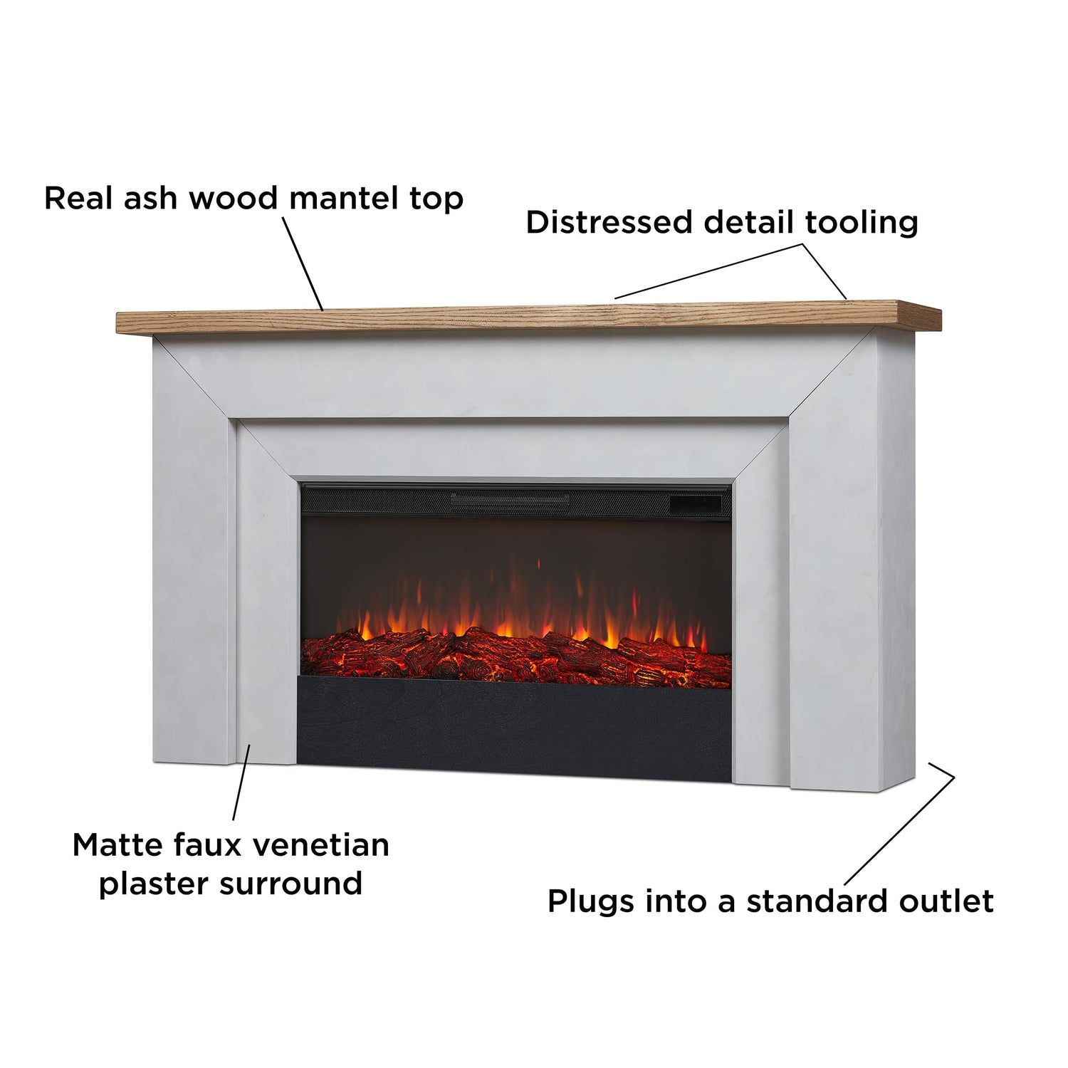 • Includes: Mantel, replaceable electric fireplace heater insert, remote control, 6 foot power cord with lay-flat plug, anti-topple safety device and hardware. One year limited warranty. Assembly required.