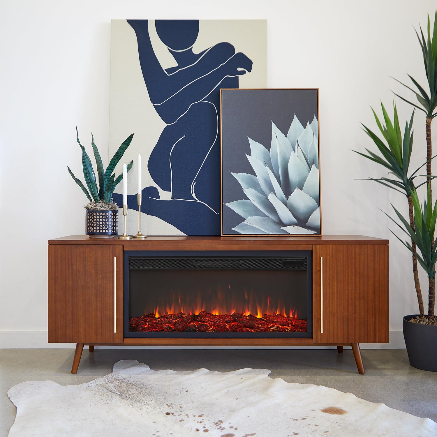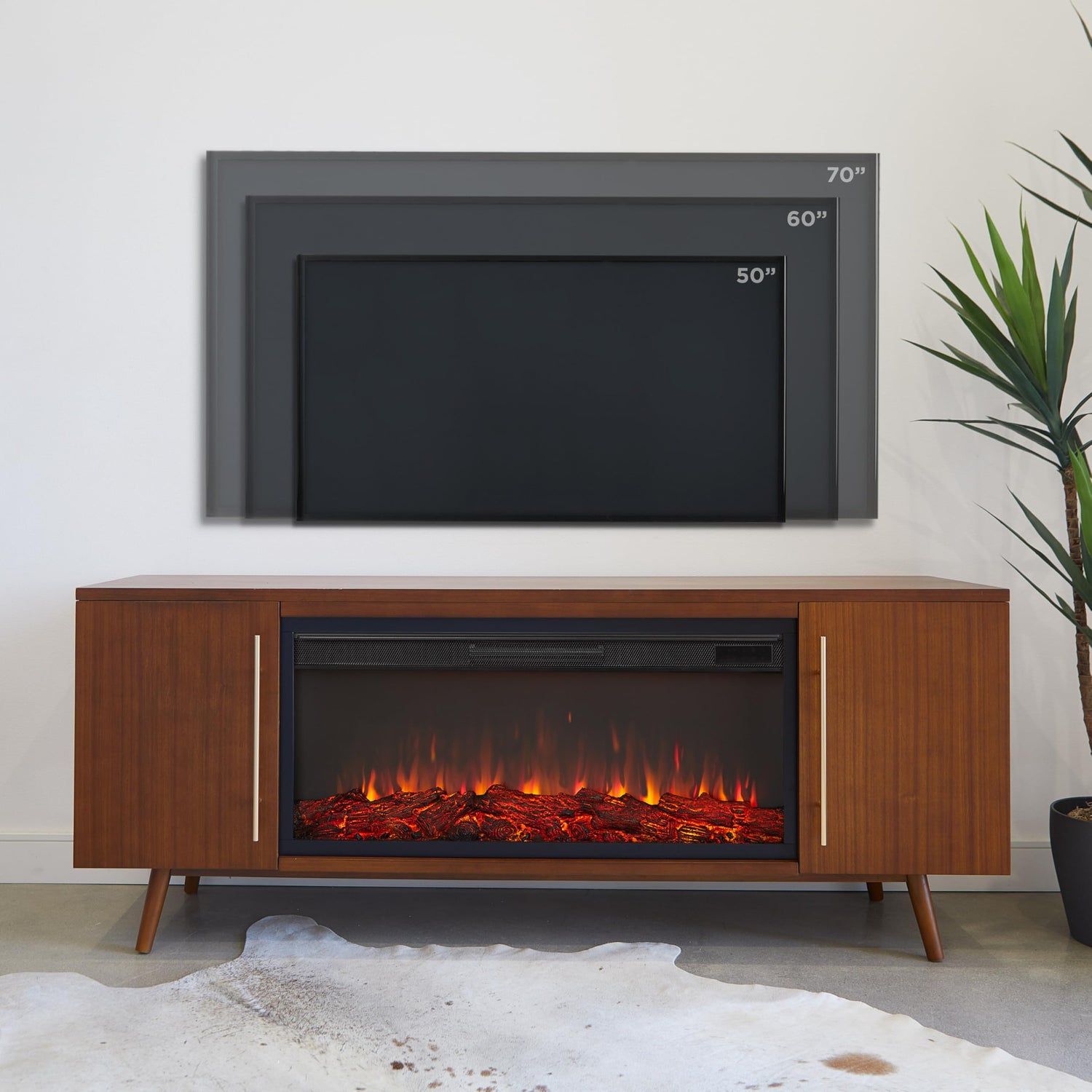 Details: With clean lines, tapered legs and minimalist hardware, the Morris electric fireplace embodies the iconic mid-century aesthetic. Enjoy the modern functions of this fireplace and practical storage possibilities while staying true to your style. Part of the Real Flame® VividFlame Landscape Series, the widescreen electric firebox mimics the look of a real, flickering fire, but does not require a chimney or vents and conveniently plugs into a standard outlet. This free-standing, extra-long fireplace entertainment center can accommodate TVs up to 70". Features a mantel with a real wood finish, six flame colors, five flame brightness levels, adjustable thermostat, timer function and automatic safety shut-off. The electric fireplace insert provides supplemental heat for rooms up to 1,000 sq ft or the heater can be turned off so you can enjoy the comforting ambiance of a glowing fireplace year-round. Mantel, firebox with log set, hardware and remote control are included. At Real Flame Company, we are committed to providing beautifully designed, safe, high-quality indoor electric fireplaces, outdoor gas fire pits and fire tables, and outdoor furniture.