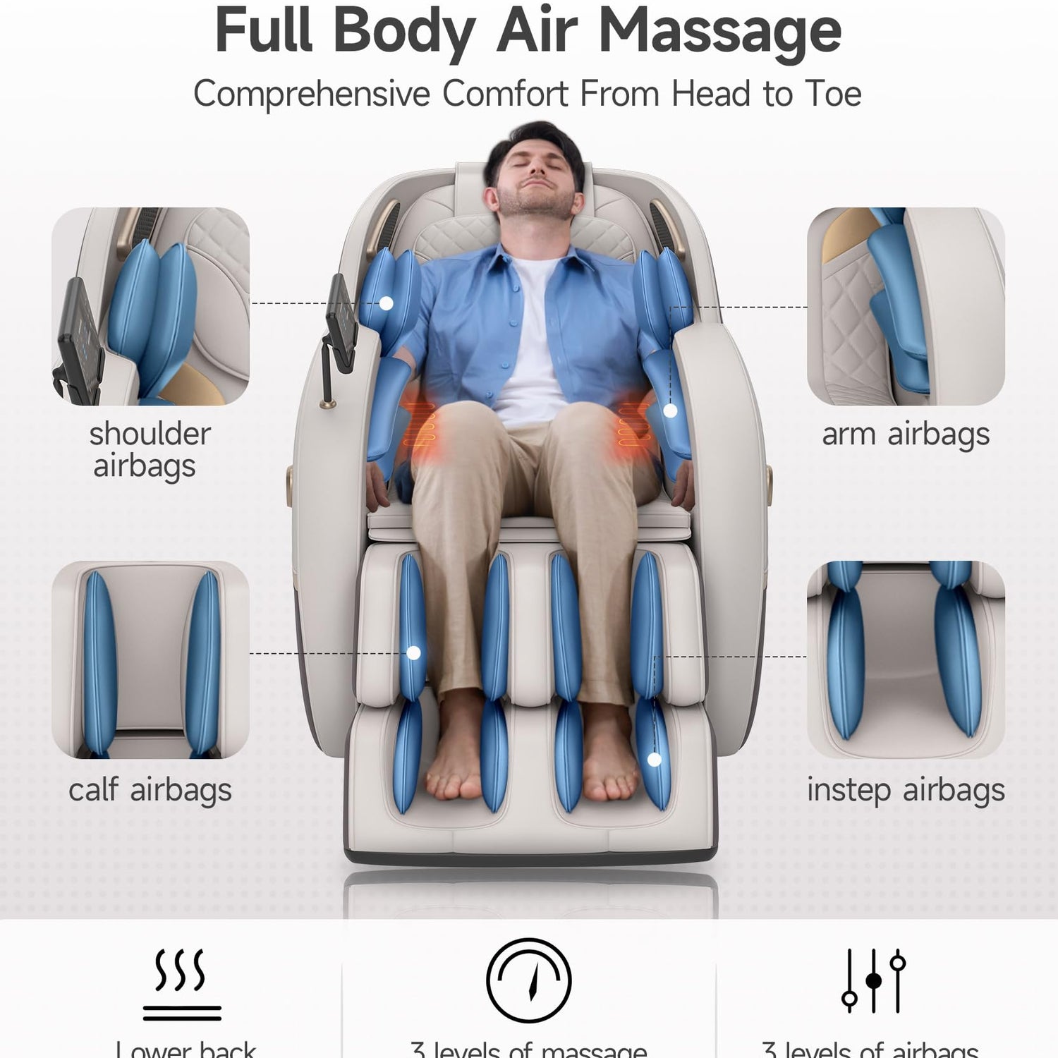 - ๐๐๐ฌ๐ฌ๐๐ ๐ ๐๐ก๐๐ข๐ซ ๐ ๐ฎ๐ฅ๐ฅ ๐๐จ๐๐ฒ ๐ฐ๐ข๐ญ๐ก ๐ ๐ฎ๐ฅ๐ฅ-๐๐จ๐๐ฒ ๐๐ข๐ซ๐๐๐ ๐ฌ - This massage chair full body offers full-body airbag compression and 3 intensity levels, targeting shoulders, arms, hips, and feet. Upgraded lower back heating enhances comfort, making this massage chair ideal for relaxation at home or office