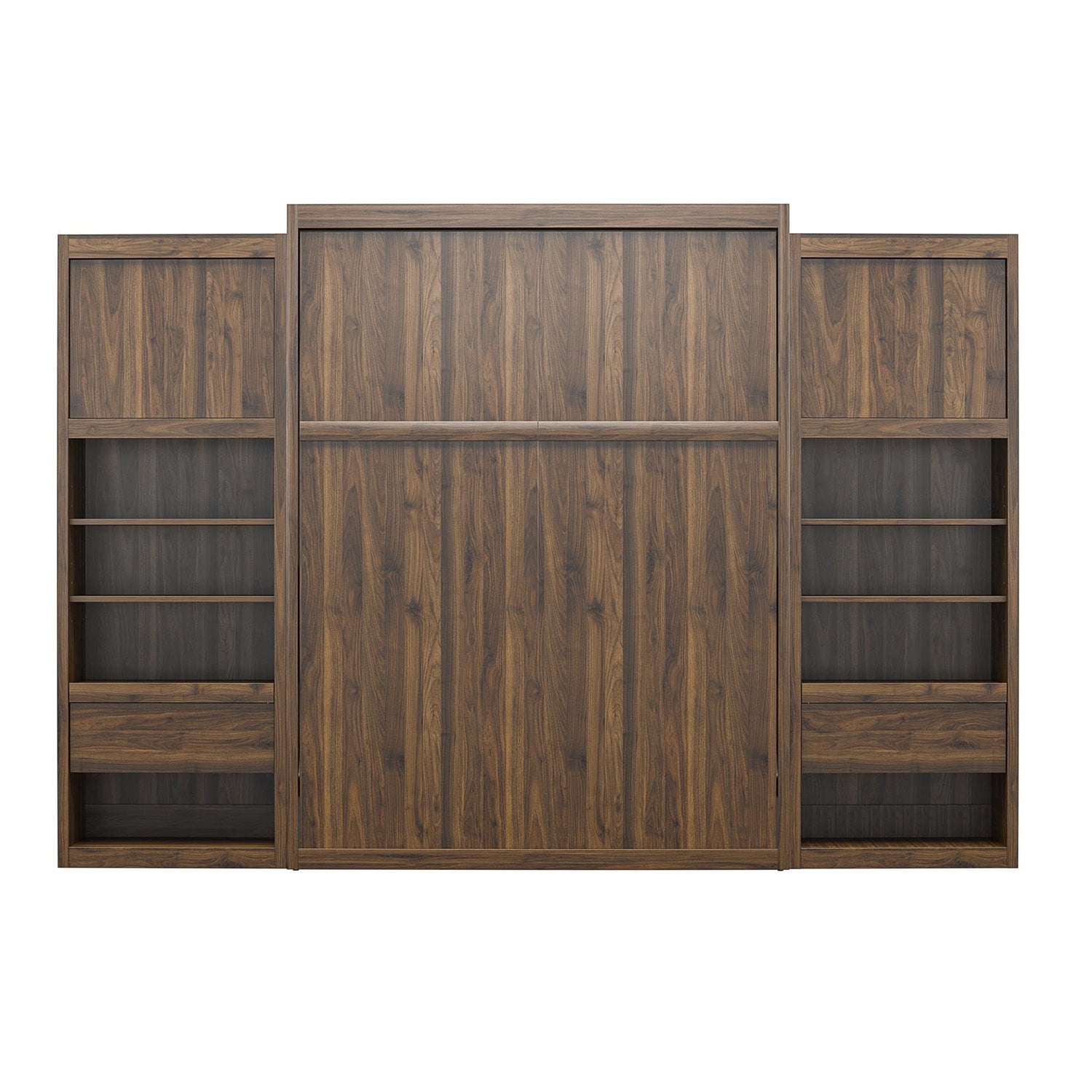 REALROOMS Halstead Queen Size Murphy Bed with 2 Nightstand Cabinets, Space-Saving Fold-Out Wall Bed with Open Shelving and Concealed Storage for Bedroom or Guest Room, Walnut