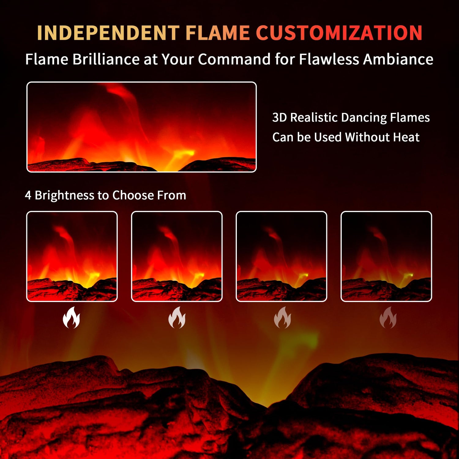- Realistic 3D Flame: The 3 sided window view of the electric fireplace provides a realistic 3D rolling flame effect, using resin logs and embers to give you more comfortable visual experience. 4 brightness levels are adjustable, you can set the flame brightness for different occasions to create a warm atmosphere. And the flame effect can be turned on individually to add more elegance to the decor. Allows you to create an inviting fireside ambience and relax