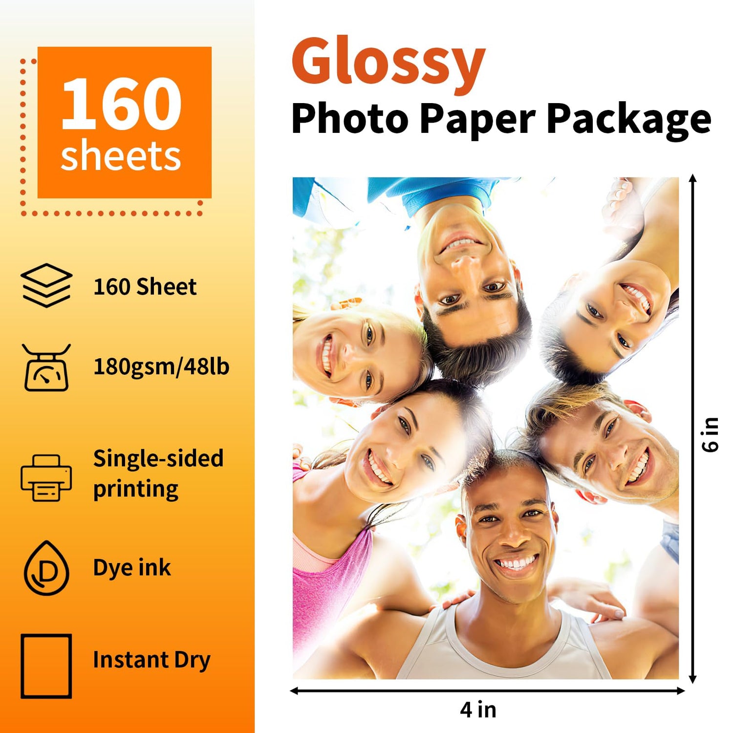 - Photo Paper Package: 160 sheets of glossy photo paper, 4 x 6 inch, industry standard 180gsm/48lb, single-sided printed, blank back side for recording or writing something; compatible with inkjet printers and dye ink
