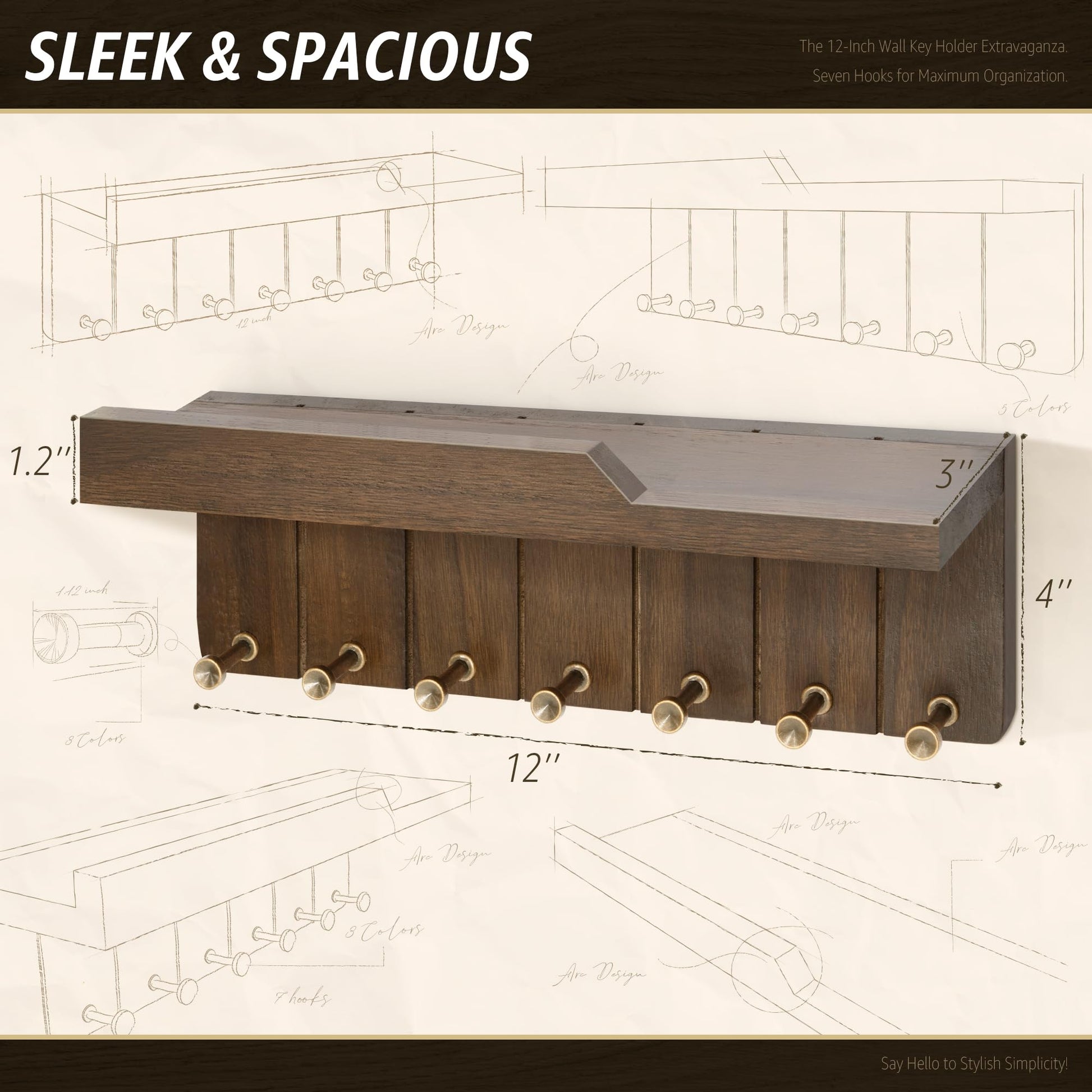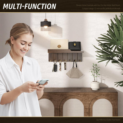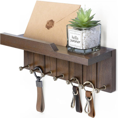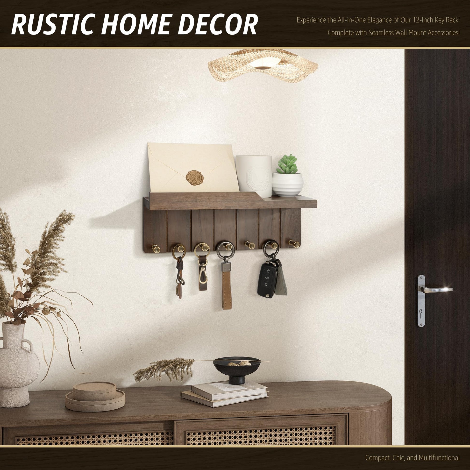 Rebee Vision Farmhouse Key Holder Wall Mount - Decorative Key and Mail Holder for Wall with 7 Hooks and Shelf Organizer - Ideal Apartment Essentials for Aesthetic Home Decor (Rustic Brown)