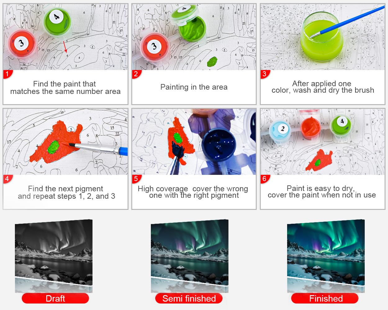 - Easy to Use: Paint by number kit are suitable for adults, children and beginners of all ages. Follow the instructions to writing painting and you can get a lot of fun from it.You complete the adult digital DIY paint and use it to decorate your room.