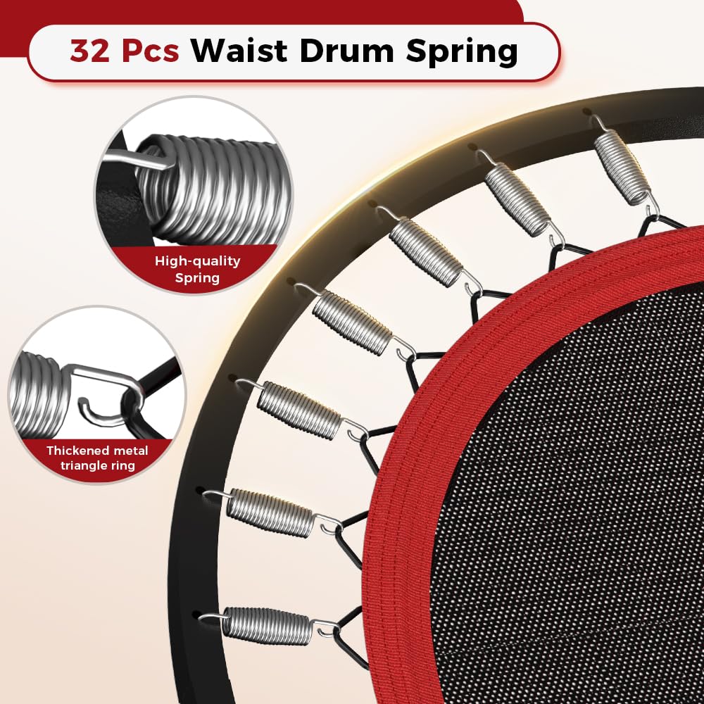 - Premium Quiet Bungees - The fitness trampoline is rigorously tested and quality inspected to hold up to 460 lbs. Equipped with 32 high-quality spring to provide adequate support and bounce to minimize impact on joints and reduce the risk of injury.The 40 inch trampoline deliver a comfortable workout experience and ensure comfort and knee/back protection.
