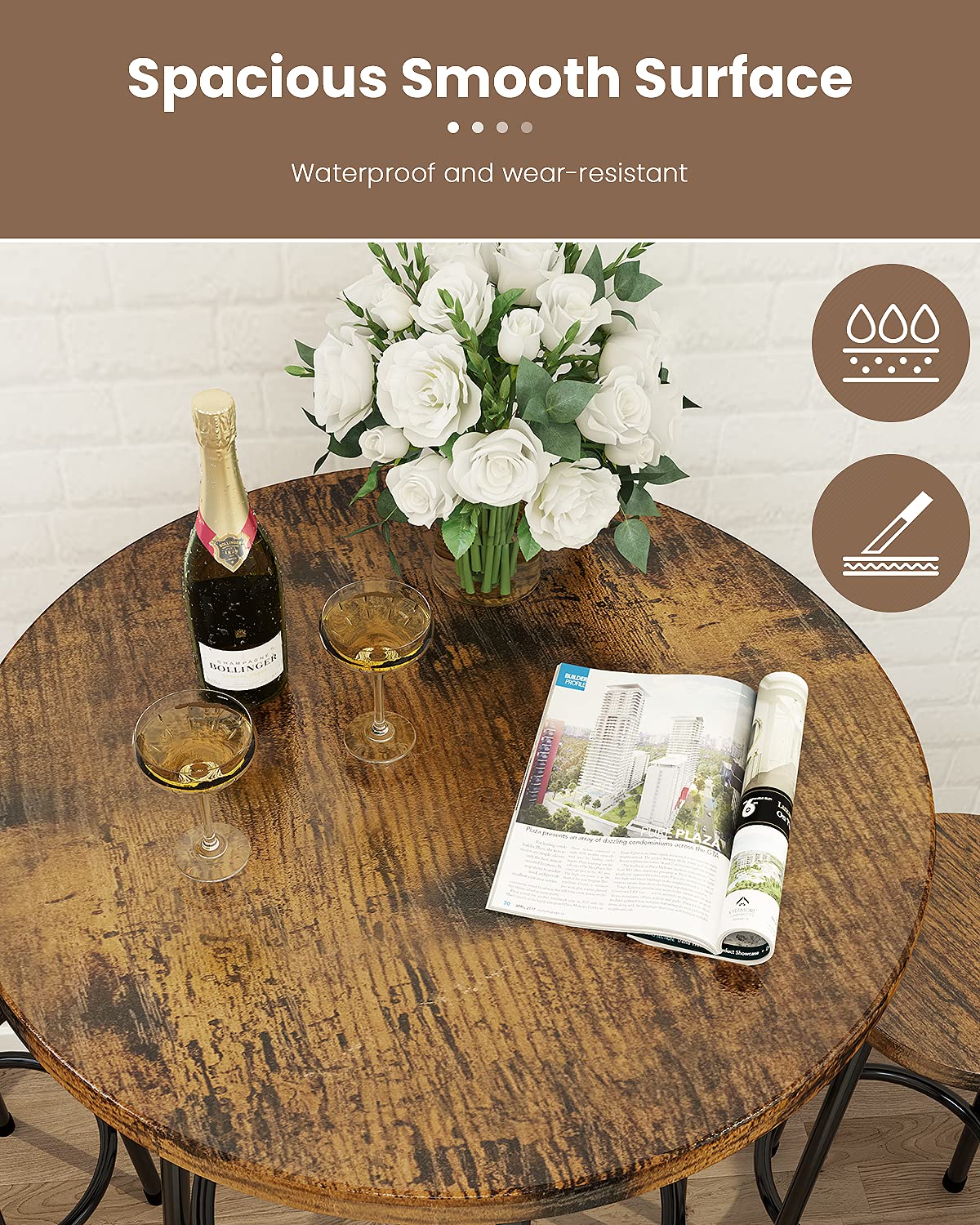 - Super Sturdy & Stable Construction - 3 Piece Pub Dining Set: This 23” round pub table set is made of premium MDF and sturdy metal frame, which is corrosion-resistant and durable for a long lifespan. The bar table made of thick board and thick metal which ensures stability and durability. The legs are super stable on the floor, with no wobbling issue at all. The weight capacity of the stool is up to 250lbs.