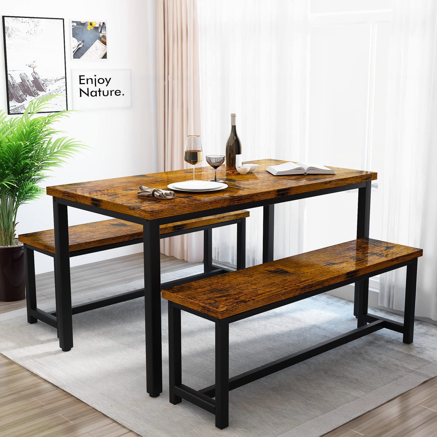 Recaceik Dining Table Set for 4 Kitchen Table Set with 2 Dining Benches, 3 Piece Farmhouse Dining Room Table Set Industrial Breakfast Nook Table Set for Small Space, Apartment, Rustic Brown