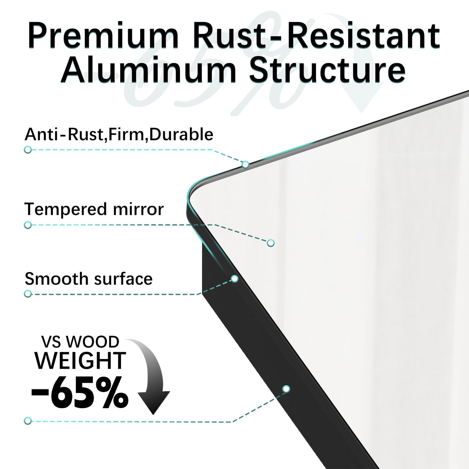 - Durable Aluminum with Tempered Mirror: Built with rust-resistant aluminum alloy for humid bathroom or restroom environments. Upgrading the bath vanity mirror to long tempered mirror with soft close hinges enhances scratch resistance and provides a smoother experience.