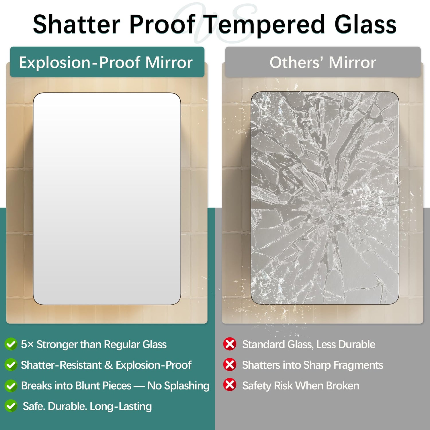 - Matte Black Framed: Elevate shaker style with a modern black rounded rectangle trim. Its flush mount flat mirror blend perfectly with contemporary or luxury decor, while the durable, decorative metal frame adds both style and strength.