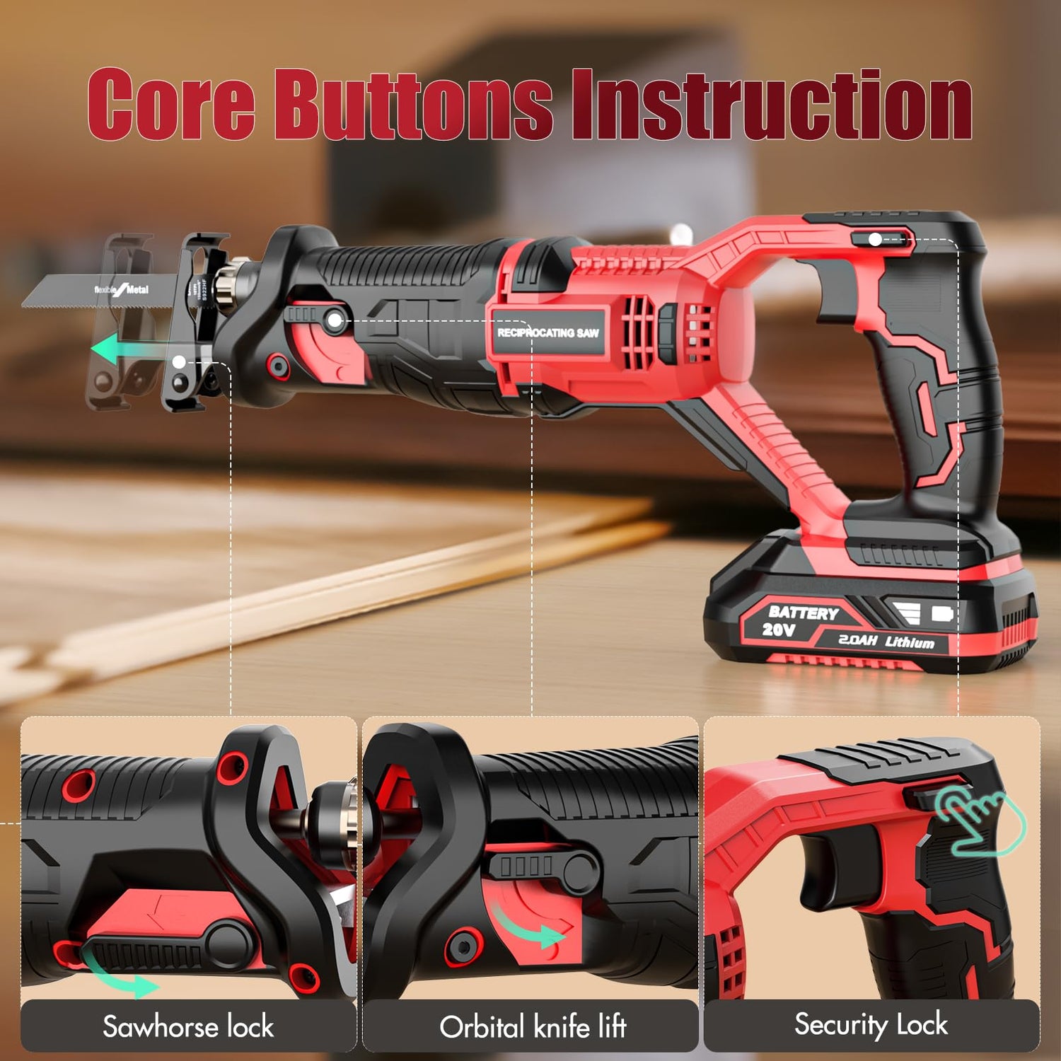 Details: 20V Cordless Reciprocating Saw, 2.0Ah Lithium Battery Pack, 0-3000RPM Variable Speed, 6 Saw Blades Wood/Metal/PVC Pile Cutting Electric Saw with Orbital Cutting Switch