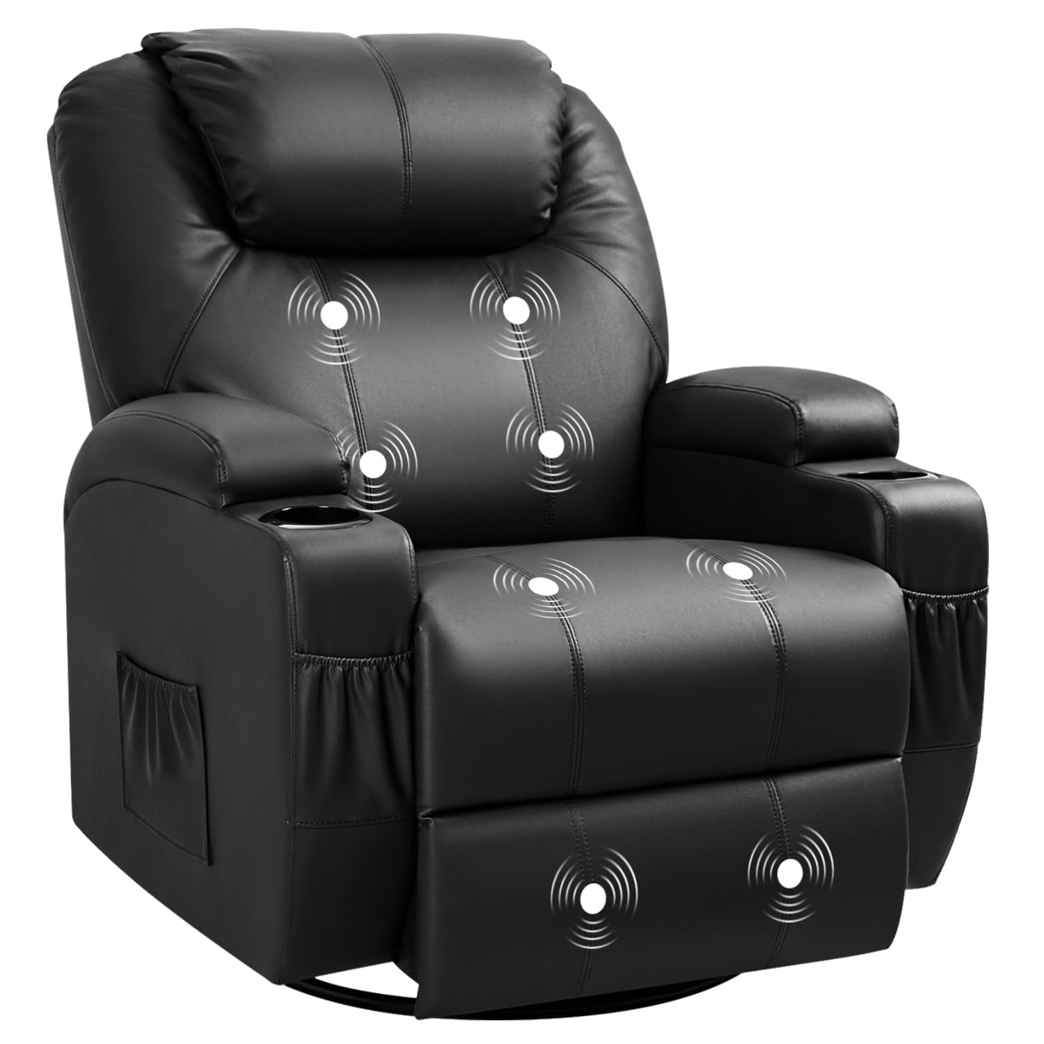 Recliner Chair, 360° Swivel Rocker Chair for Adults, Rocking Recliner Chair with Massage, Comfy Single Sofa with Side Pockets Cup Holders for Living Room, Bedroom, Nursery (Leather, Black)