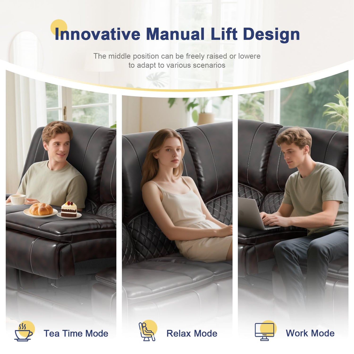 - Versatile Middle Seat: Inspired by the practicality of coffee and sofa tables, the middle seat of this recliner sofa is designed to maximize functionality. You can comfortably work on your laptop or enjoy a meal without the need for an extra table. The middle seat features a spacious hidden storage compartment that’s perfect for larger items like wine bottles. Additionally, the seat lifts easily to meet your storage and functional needs.