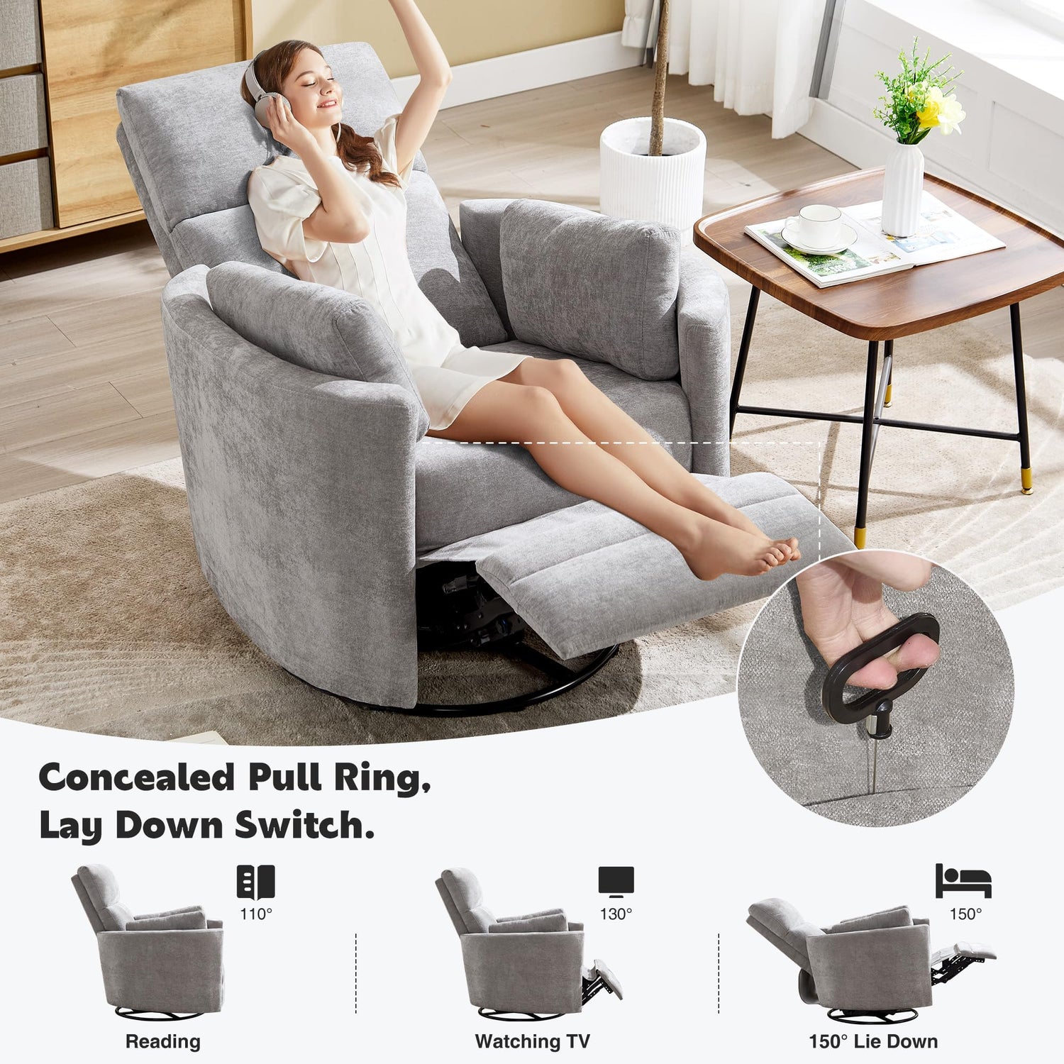 Recliner Swivel Rocking Glider Chair, Upholstered Nursery Adult Recliner Rocking Chair with 2 Pillows for Living Room Bedroom(LIGHTGREY, Manual Operation)