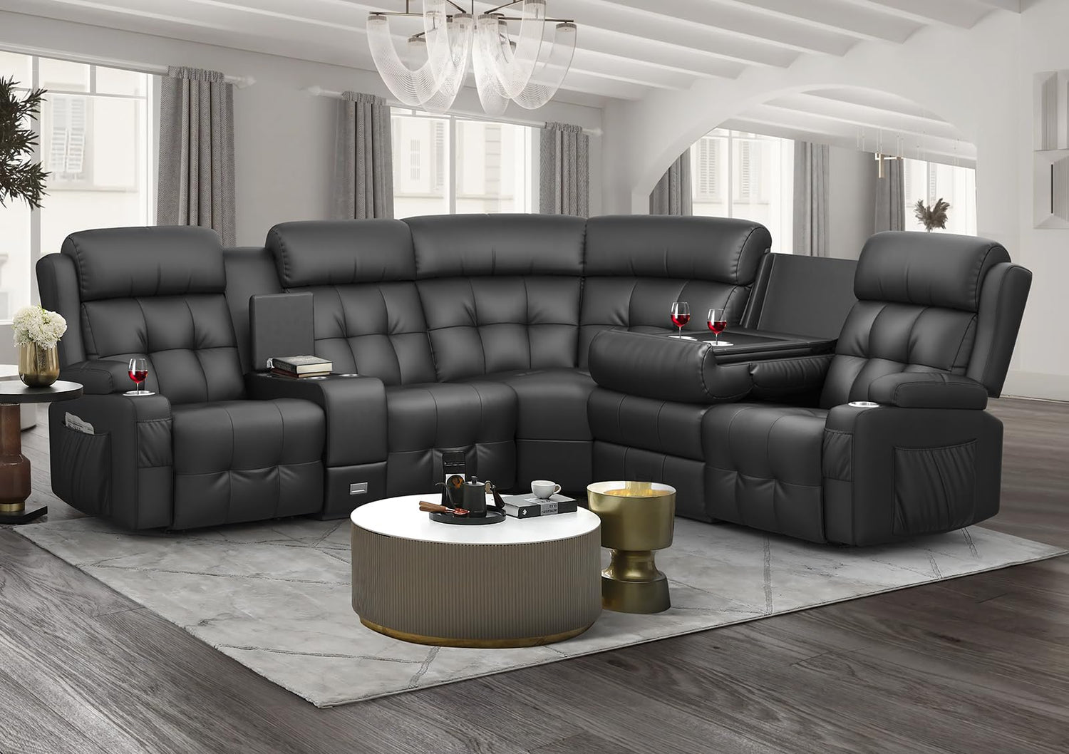 Details: Reclining Sectional Couches for Living Room, L Shaped Large Sectional Reliner Sofa, Faux Leather Couch, Home Theater Seating with Console, Recliner Couch & Sofa
