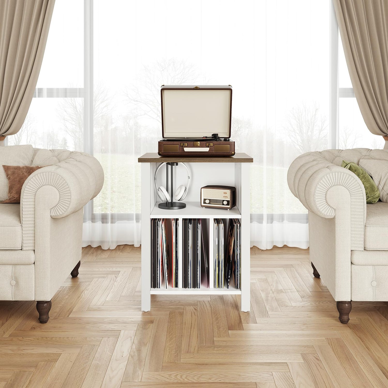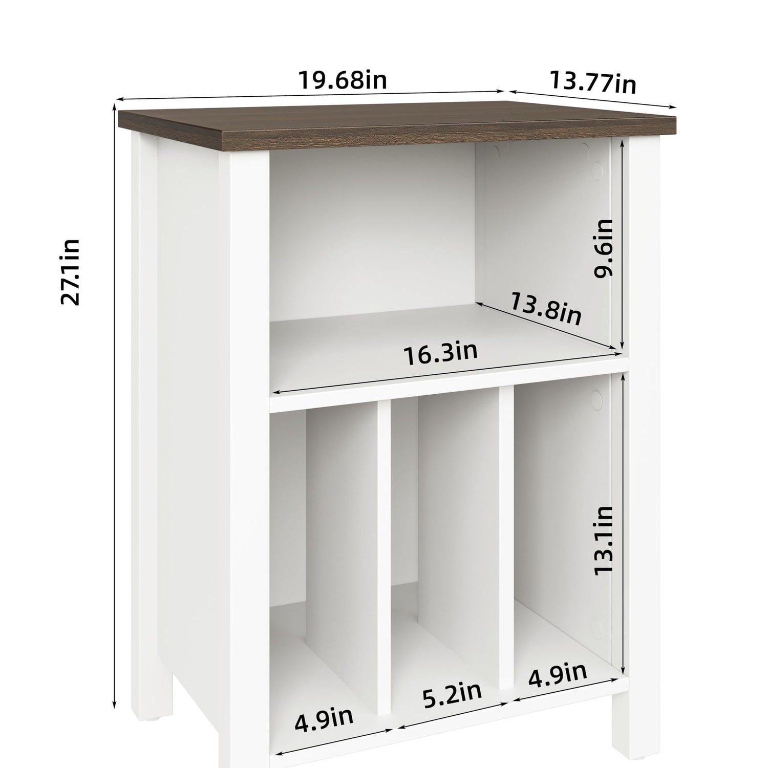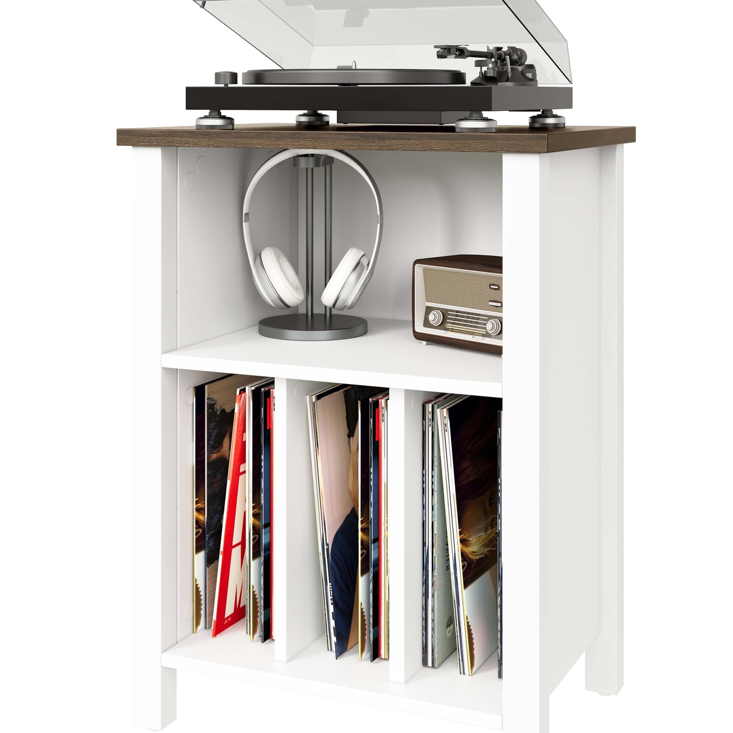 - Large Record Player Stand- This sturdy record storage cabinet adopts a full wooden structure. White vinyl record storage with walnut top giving it a superior appearance and texture. The size of the record player table is 19.68"D x13.77"Wx27.1"H, which can hold 130 records