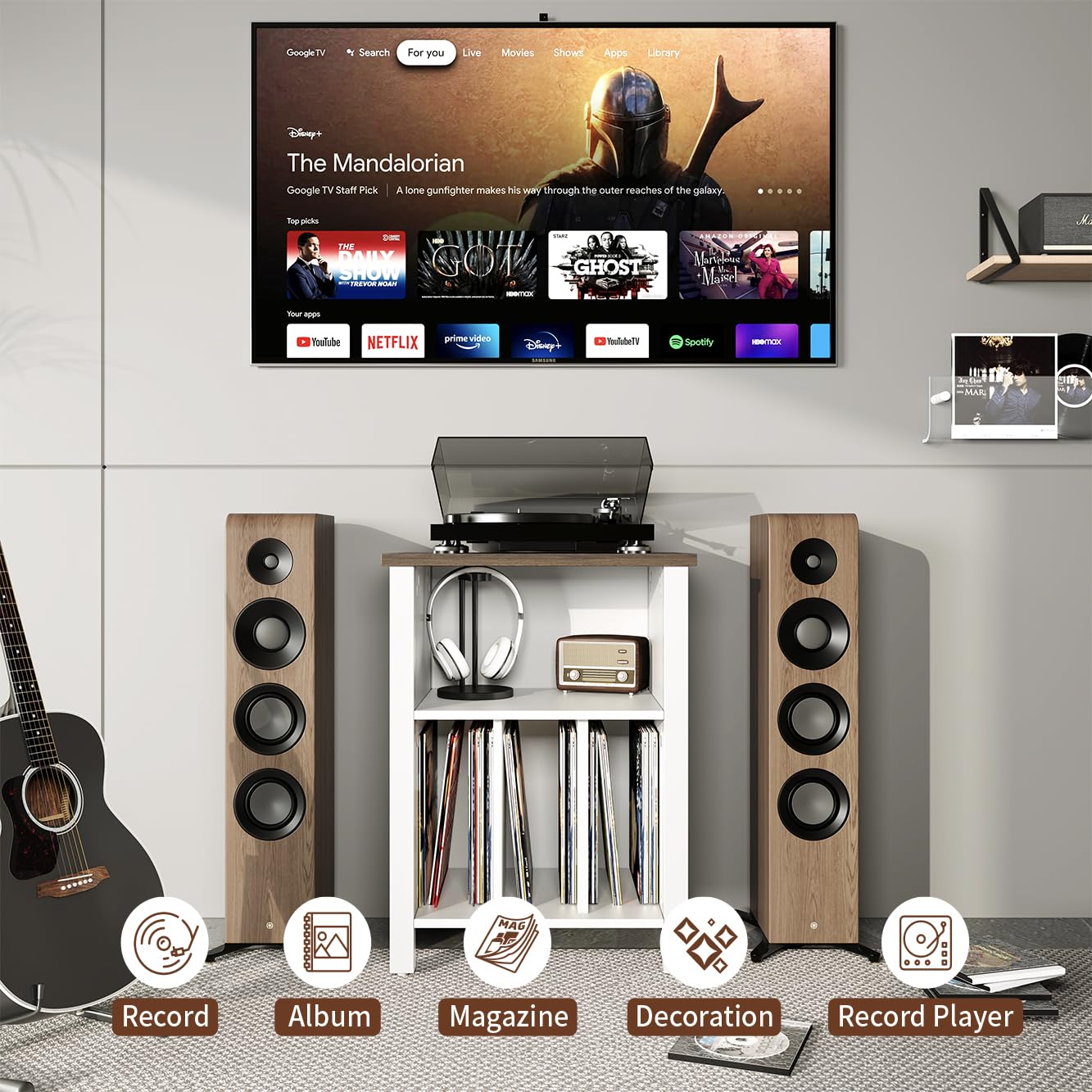 - Multipurpose Display Stands- This end table offers three separate storage spaces. The top layer is designed for the turntable, the middle layer for audio accessories, and the bottom section with dividers for vinyl records. It's perfect for storing vinyl records, albums, magazines, and other items