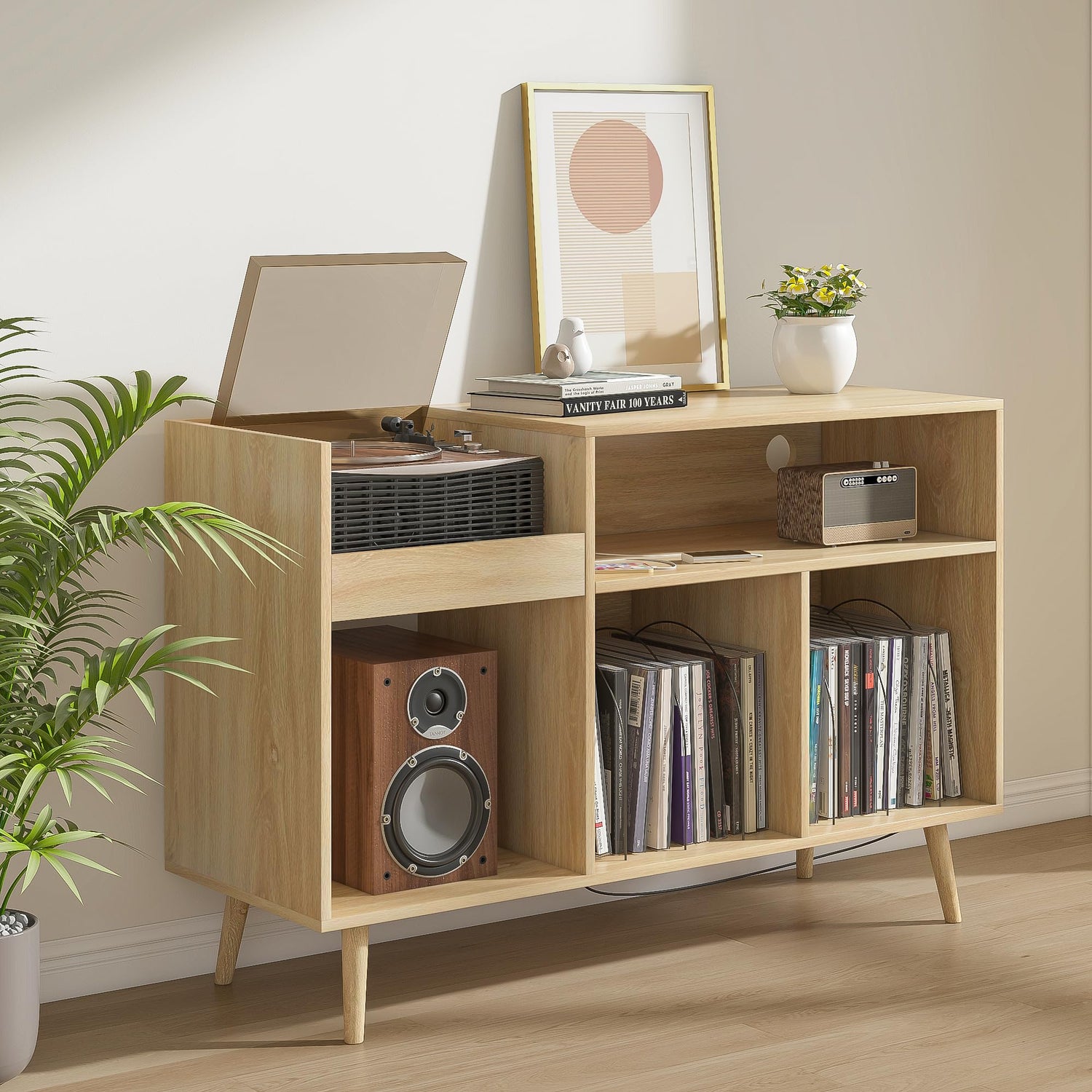 Record Player Stand with Charging Station & USB Ports, Mid-Century Turntable Stand Table Holds Up to 300 Albums, Vinyl Record Storage Cabinet with Wood Legs for Living Room Office (Wood)