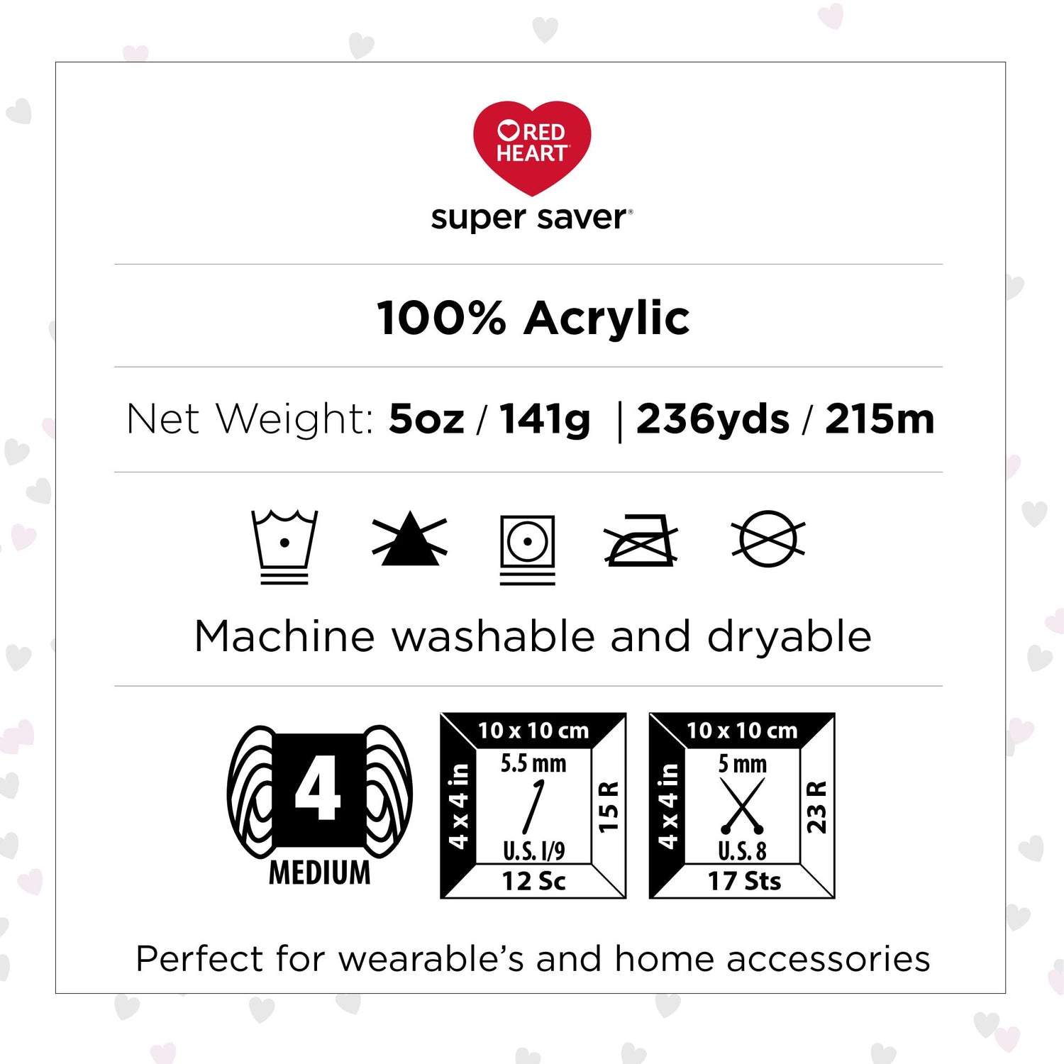Details: Super Saver yarn has been a favorite among knitters and crocheters for over 30 years. This 100% acrylic worsted weight, size 4 yarn comes in over 120 beautiful colors, so you will always find the perfect color to complete your project. After you make your project it will be made to last, as Red Heart Super Saver yarn is durable and will stand the test of time, wash after wash. This product holds the OEKO-TEX Standard 100 certification.
