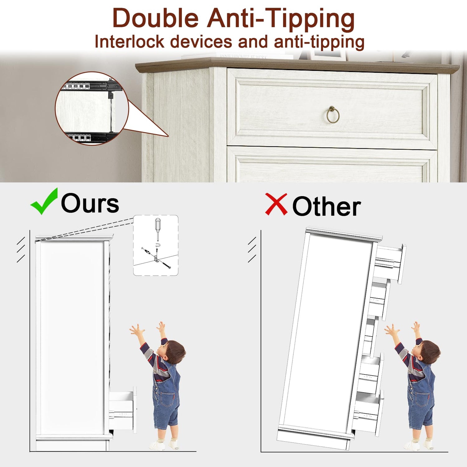 Details: Dresser with 5 drawers has a double anti-toppling devices (interlock device and anti-toppling device) to prevent accidents. Attention: Any two drawers can't be opened at the same time. The double anti-tip devices maximizes the safety of you and your family.