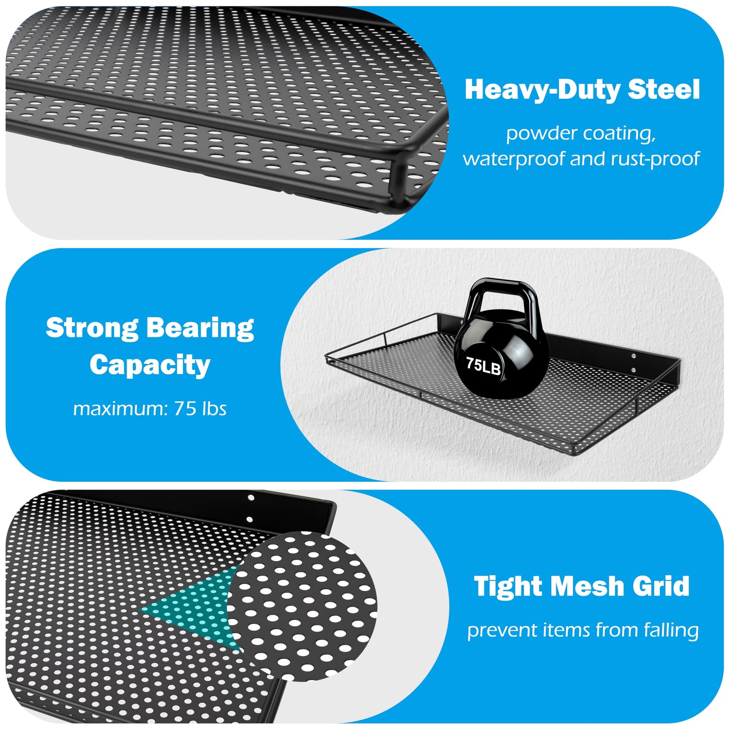 - Space Saving: The wall mounted shelves make full use of wall space to improve space utilization. Free up the floor area and bring order to a cluttered garage. The maximum load capacity can reach 75 lbs to fully meet the needs of daily use.