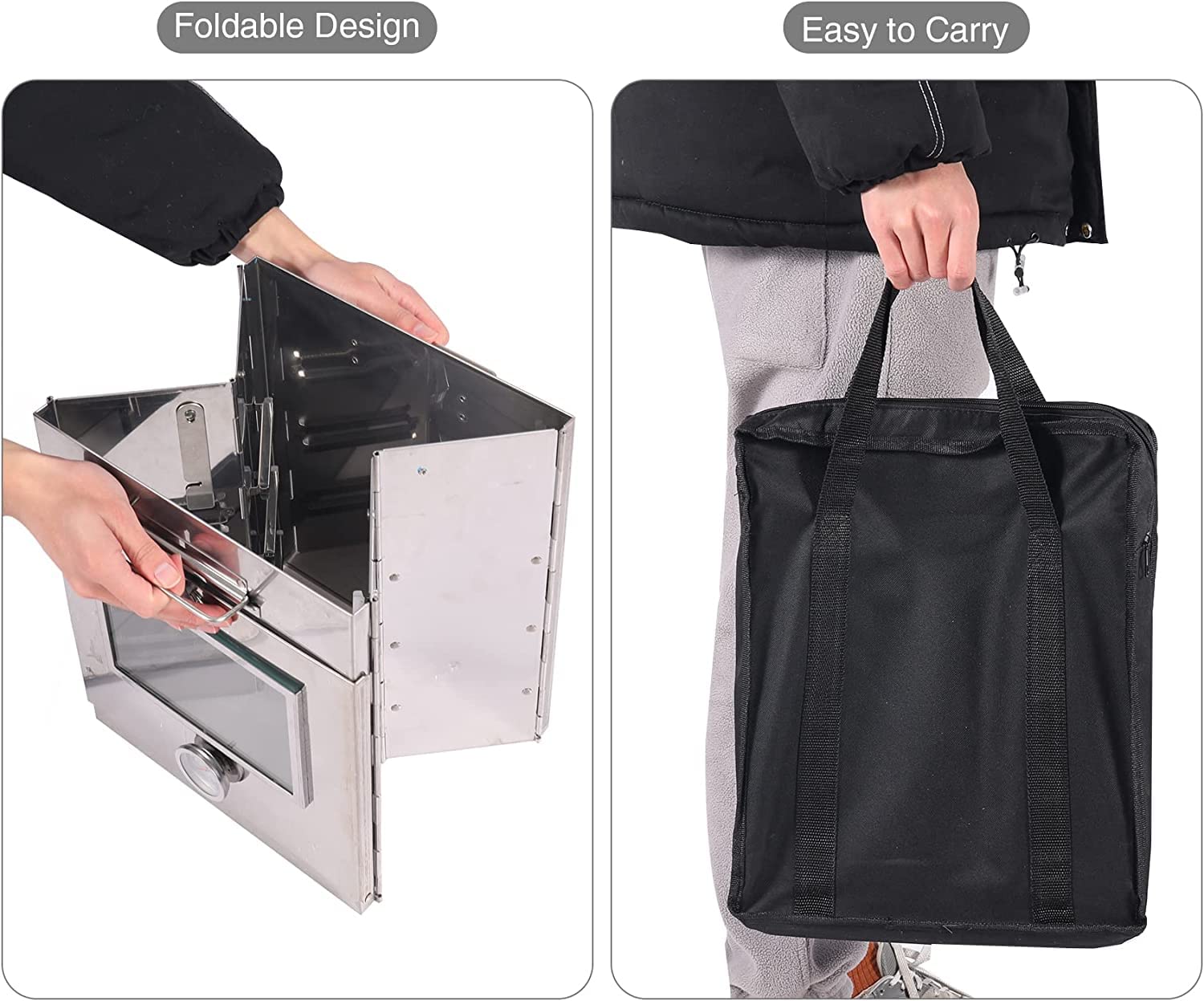 - Easy to Assemble: The portable camp oven can be assembled easily in a few minutes without any help. It is foldable and easy to carry. The extra carry bag allows you to take it everywhere.