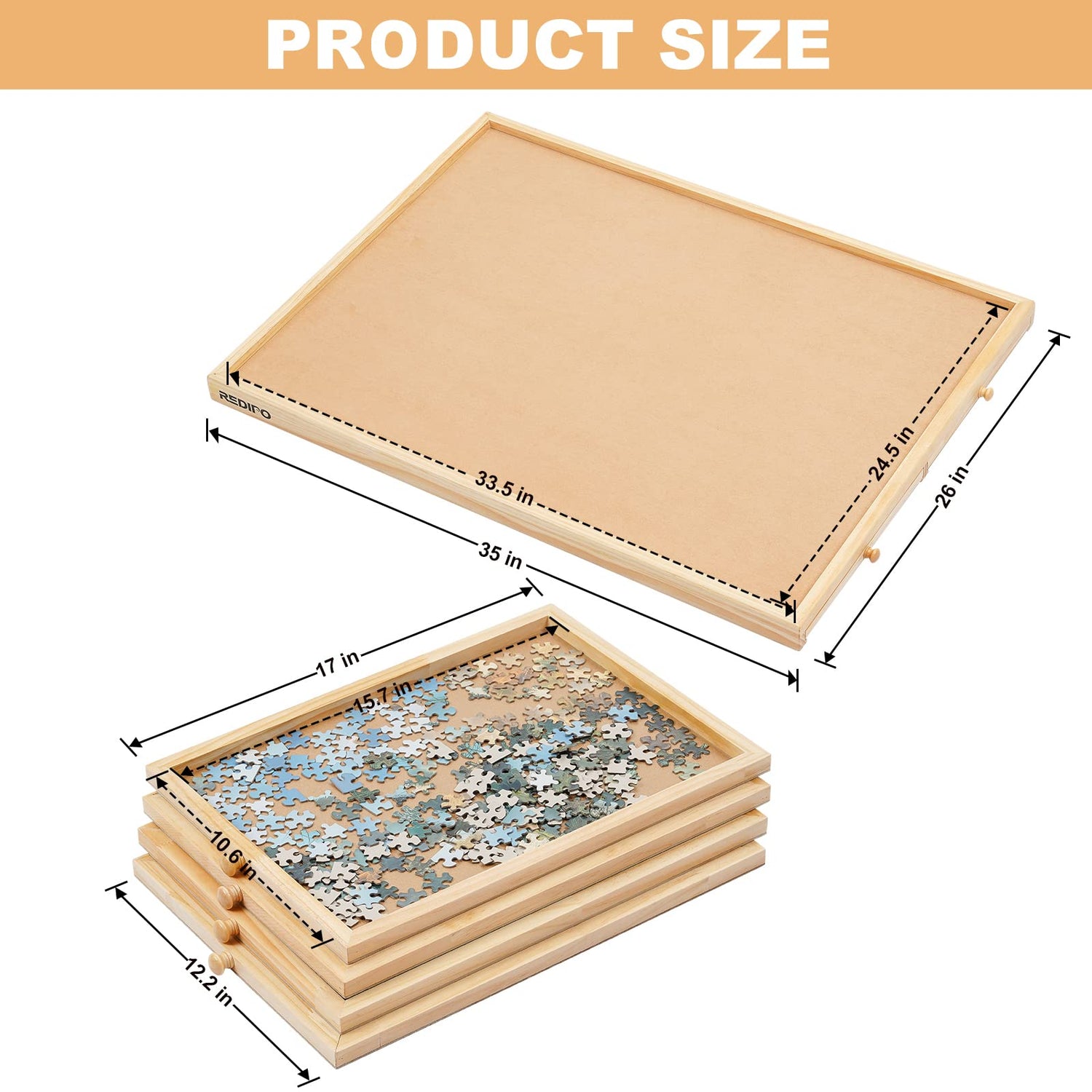 - 【PERFECT SIZE OF PUZZLE BOARD】 -- The wooden puzzle table consists of a central working panel and 4 drawers for storing puzzles .The working panel dimension is 35*26 inch, removable sliding drawers size is 12.2*17 inch, fits most 1500 pieces puzzles.