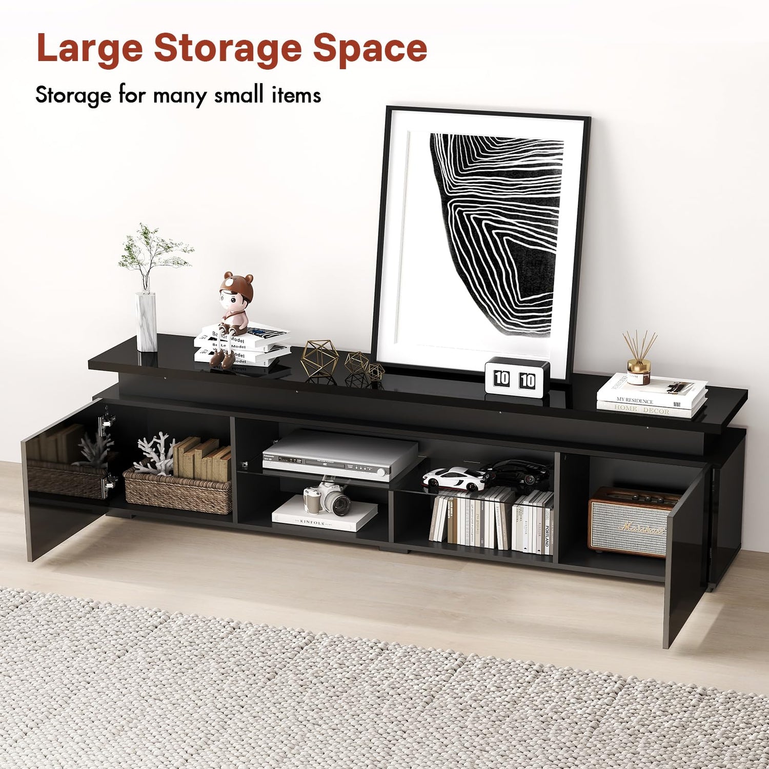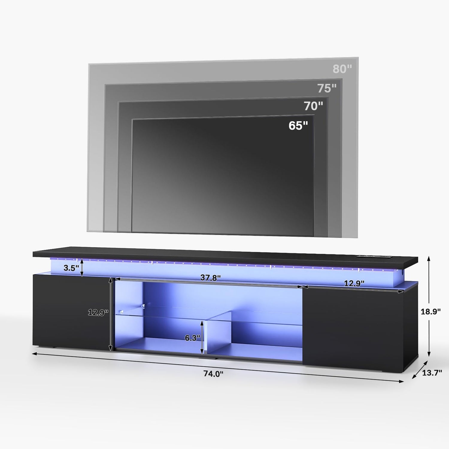 Redkey Modern TV-Stand with Light - Television Stands for 70 75 80 Inch TVs - Entertainment Center with Storage Cabinet for Bedroom Living Room - Open Glass Shelves - 2AC Outlet - Black