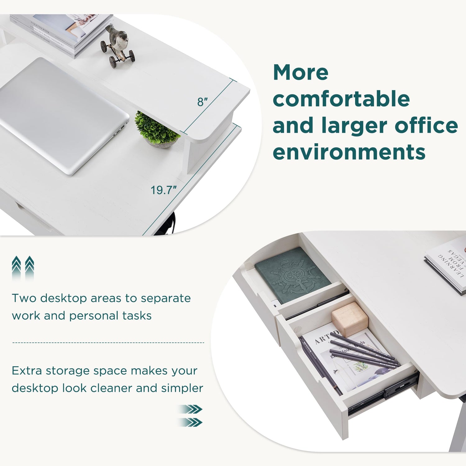 - Spacious Workspace: the monitor shelf provides a comfortable height and better control of the distance from your eyes and the angle of the screen. The under-shelf store's office supplies and displays decorative items without compromising your workspace. 60 * 60 inches allows you to use one part as your office area and the other part as your study and entertainment area