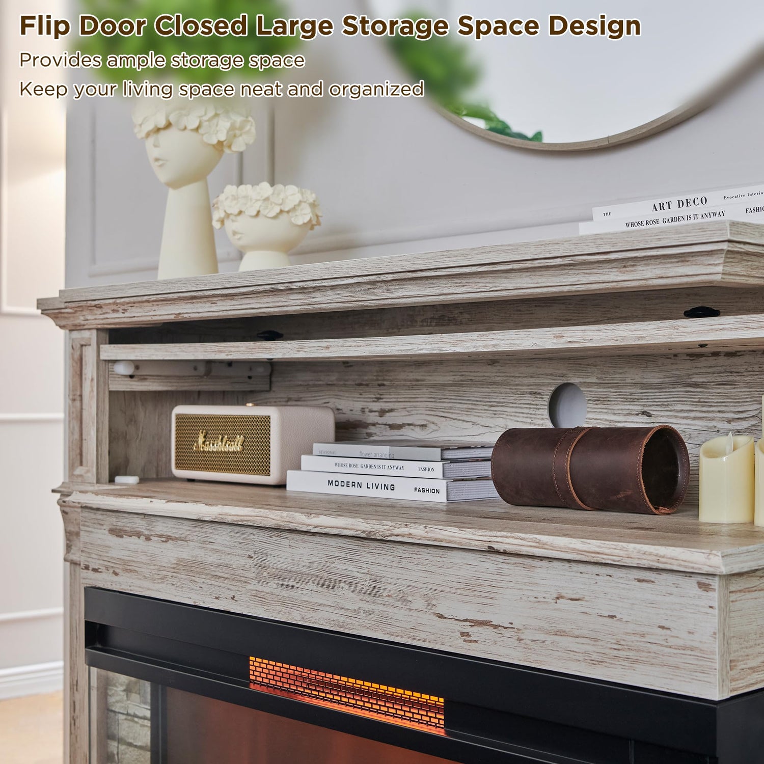 RedLemon Electric Fireplace with Mantel, 3-Sided Glass Farmhouse TV Stand with Fireplace for TVs up to 65", 52" Media Entertainment Center Console with Storage for Living Room, Antique Brush White