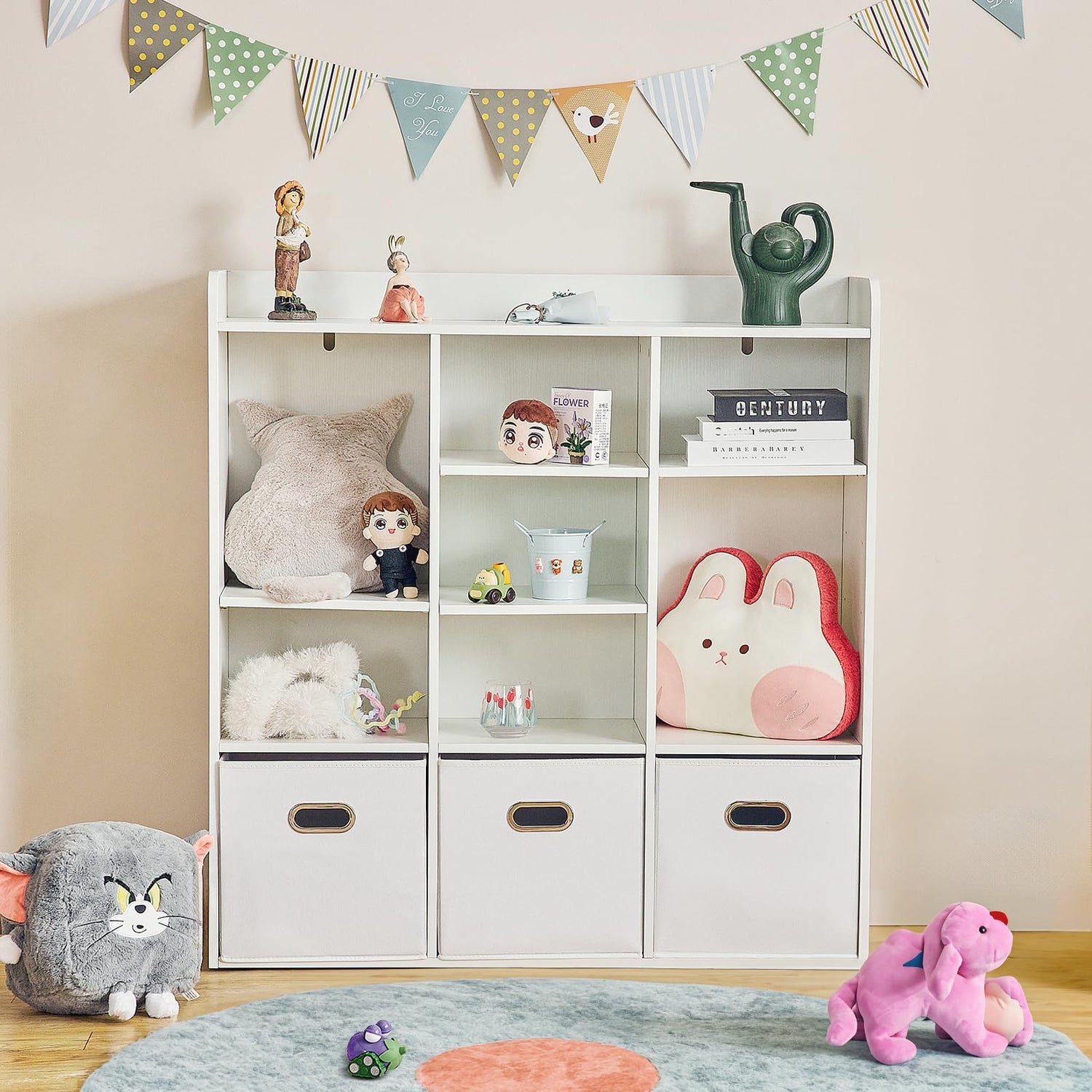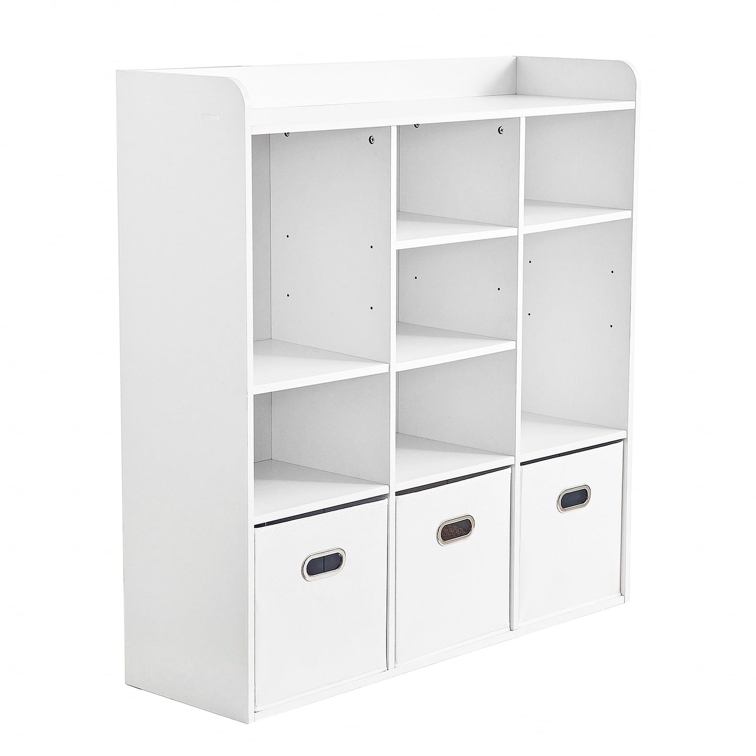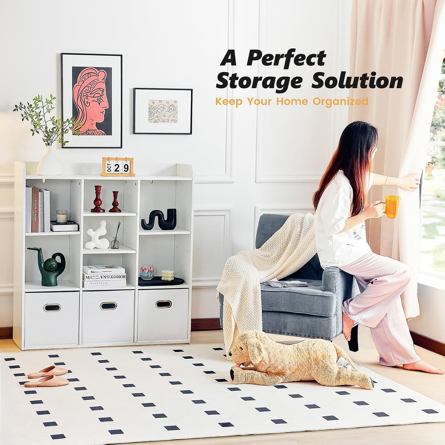 Redlife 7 Cube Bookshelf, White Cube Organizer with 3 Storage Bins, Wooden 3-Tier Bookcase with Adjustable Shelves, Modern Floor Standing Open Shelf Cabinet for Bedroom, Living Room and Office