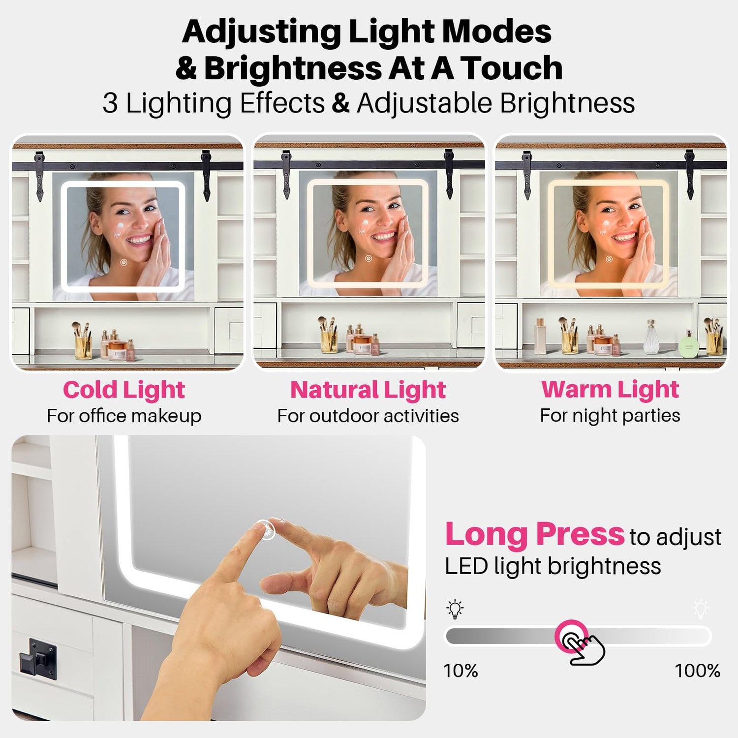 - Sliding Mirror with 3-Color LED Lights: Vanity desk with mirror and lights offers 3 adjustable lighting modes. Simply touch the button to choose from warm, neutral, and cool light, and the mirror can slide from left to right, very suitable for makeup.