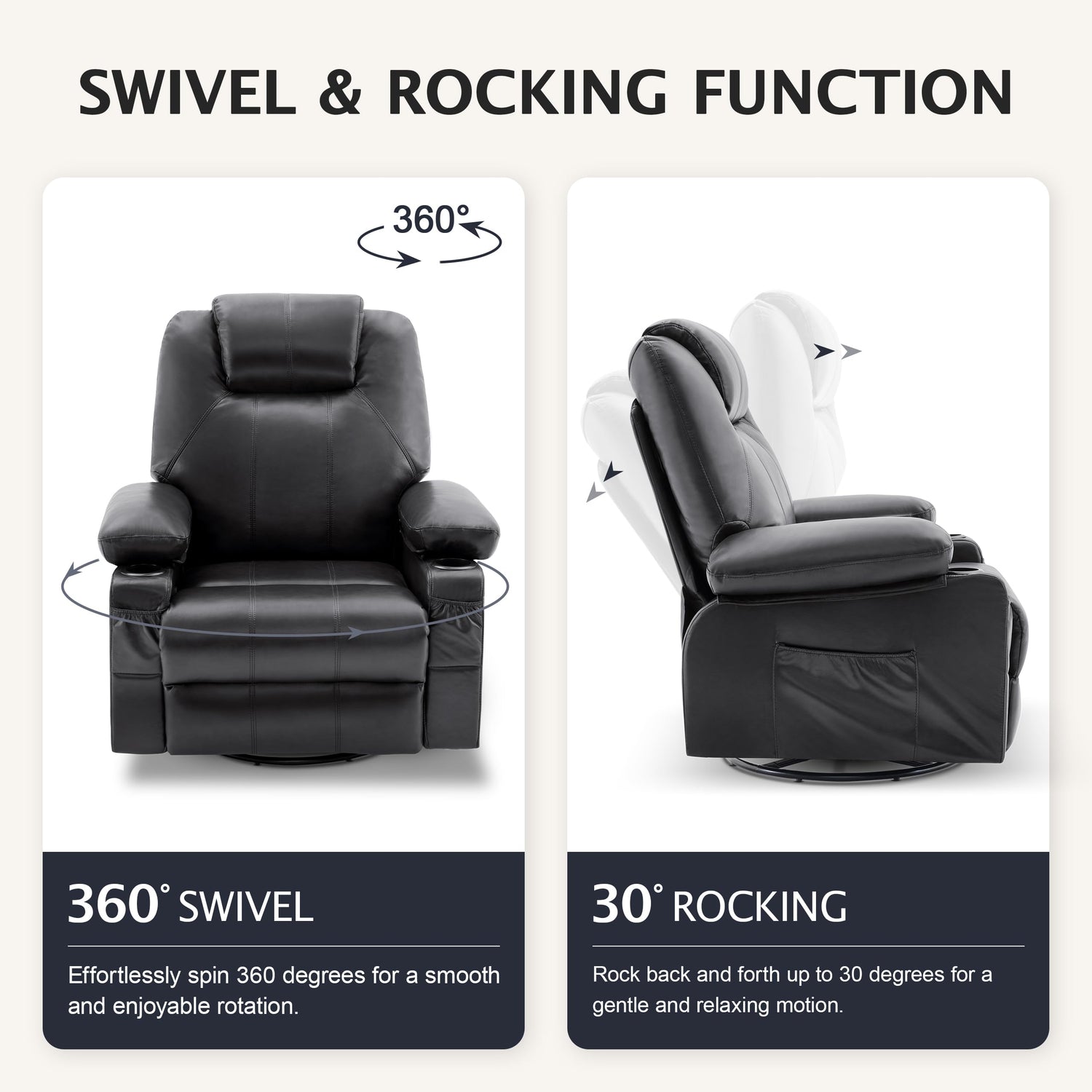 - [ROCKING & RECLINING] You can extend the footrest using a side pull buckle and recline the swivel rocker recliner chairs using your body weight (up to 150 degrees). It features a 360-degree swivel function, allowing you to freely choose the direction you want to face. It also offers a 30-degree rocking function which you can rock back and forth while watching TV or reading magazines. When closing the footrest, you may encounter some resistance, so you need to close it quickly and with force