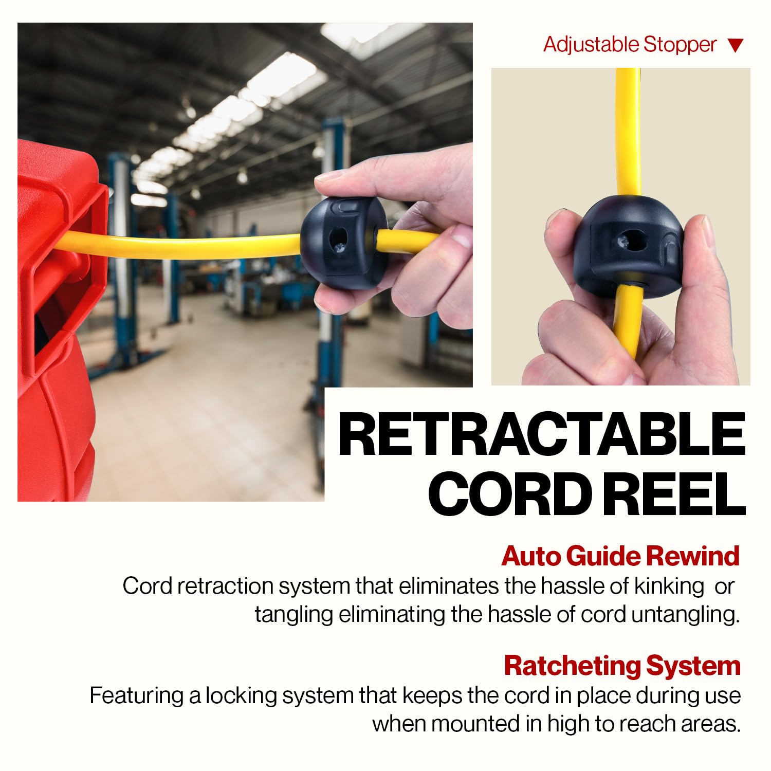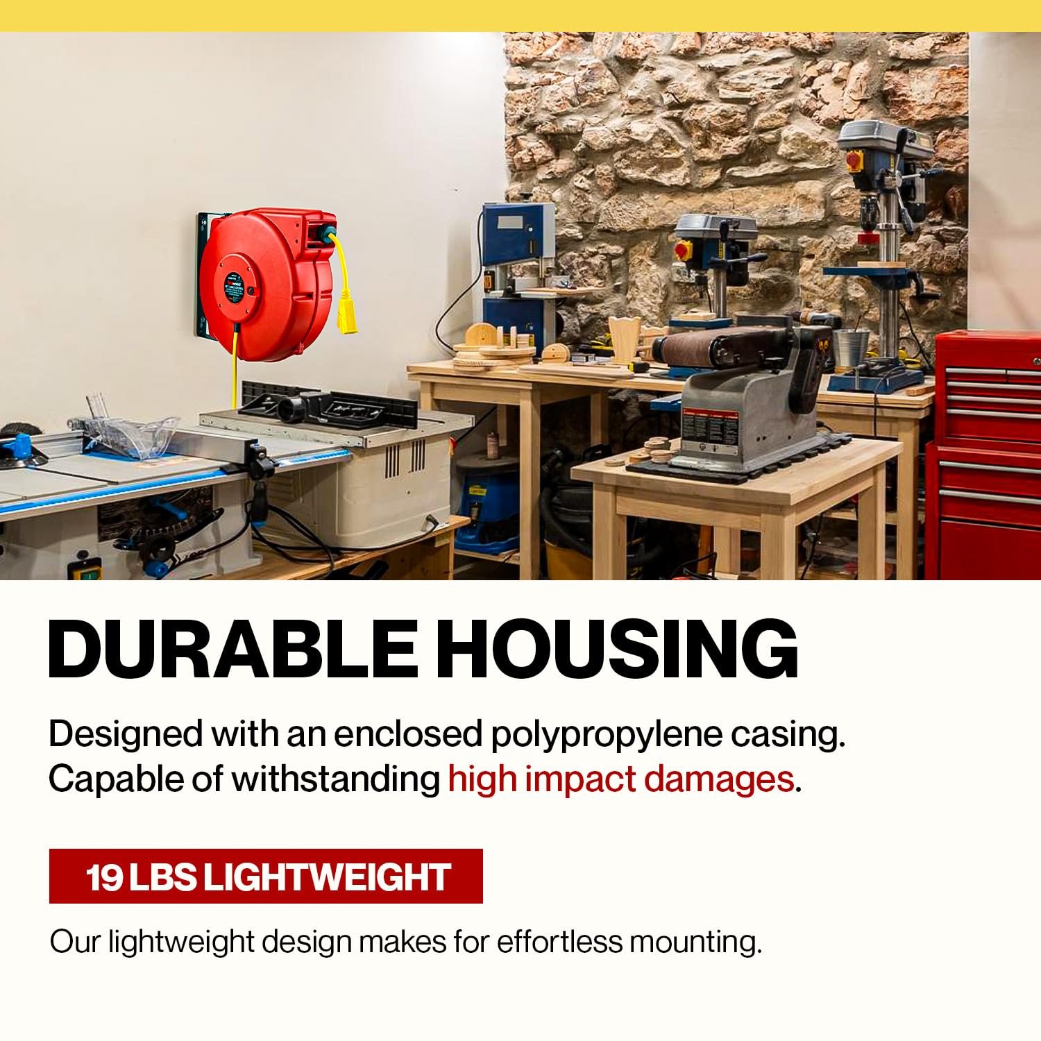 - COMMERCIAL DESIGN - This Extension Cord Reel is constructed of hard impact Polypropylene Enclosed Spring Driven Case; the reel utilizes double adjustment improved ratcheting that locks the cord at any desired length