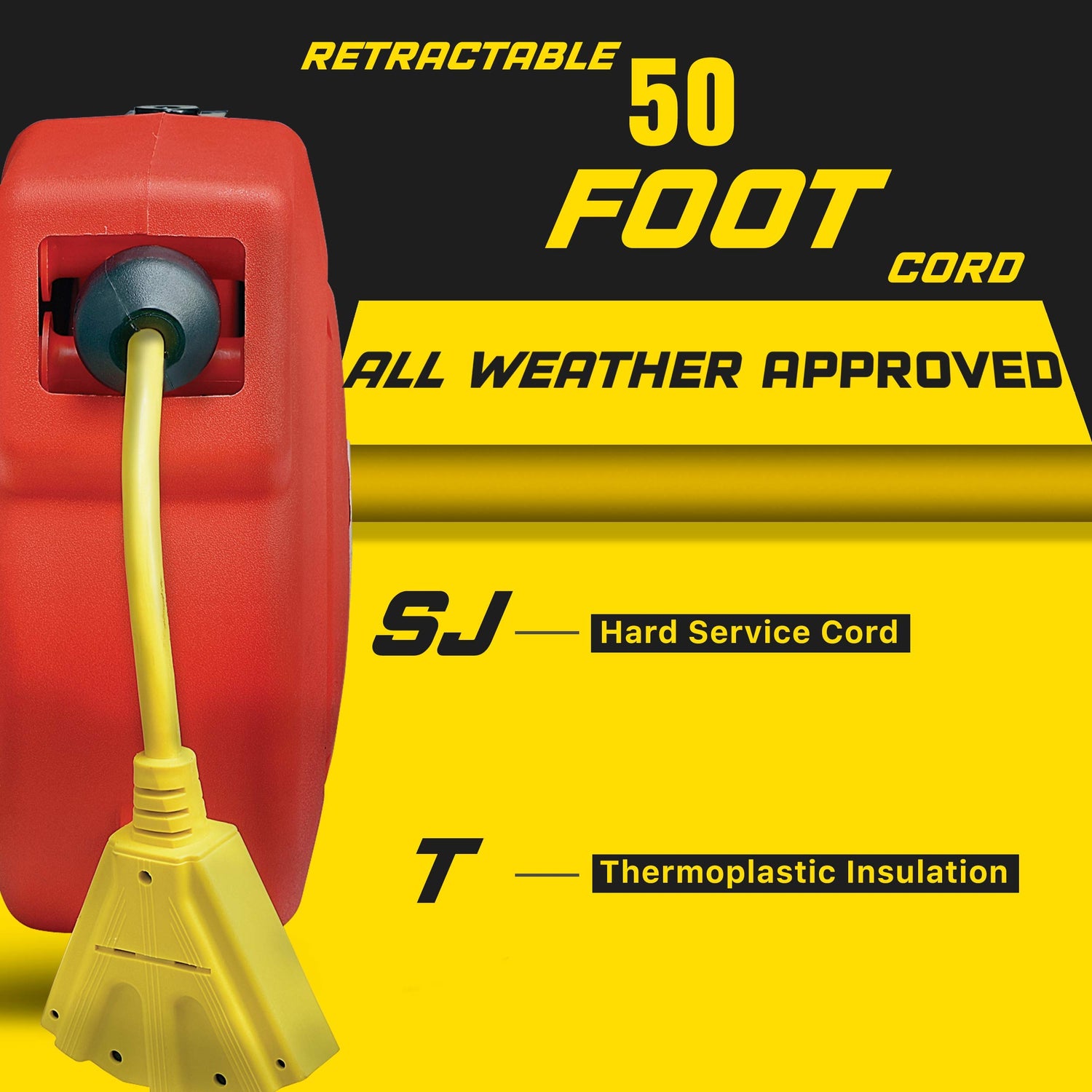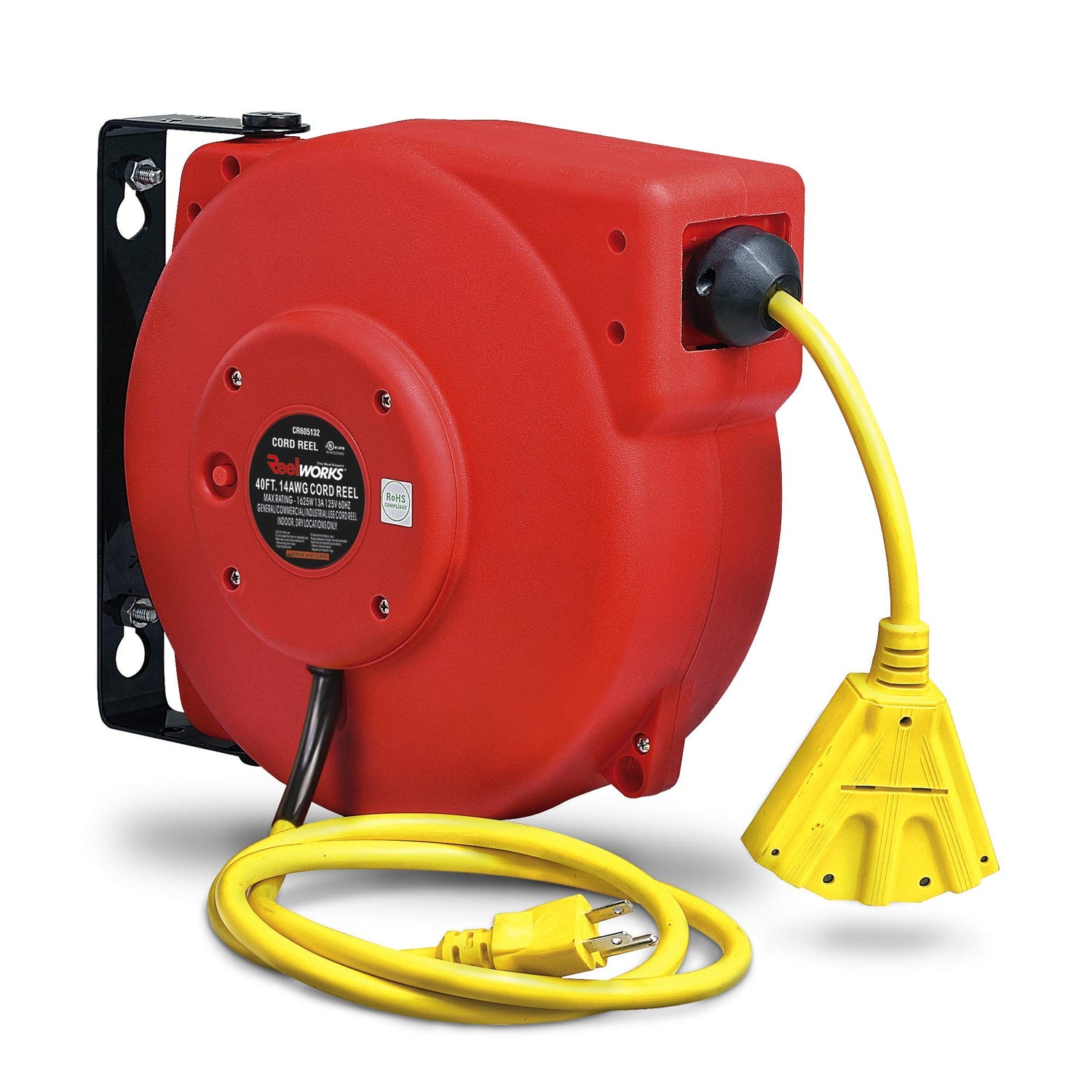 Details: The Reelworks CR605132S3A cord reel features a 40 ft. , 14 AWG/3C SJT, Triple Tap cord that allows you to have electric power whenever and wherever you need it. The spring driven retractable feature with latch keeps the cord where you want it during usage and quickly store it away when finished. The impact resistant polypropylene case with attached swivel bracket allows the unit to be mounted on a wall or ceiling; helping you keep the electrical cords out of the way when not in use. One 60 inches lead-in cord is included.