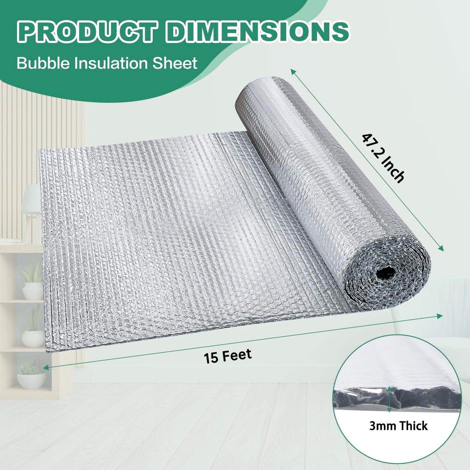 Reflective Bubble Insulation Sheet, Double Side Aluminum Foil Bubble Shield, Aluminum Foil Thermal Insulation Radiant Barrier for Windows, RV, Roof, Garage Door (47IN X 15FT)
