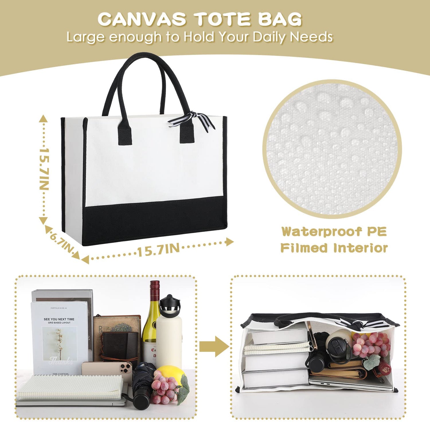 - Canvas Material: not only is this beach tote bag good looking, it is made with canvas and the liner is waterproof material; The bag can stand upright with a built in PE cushion pad at the bottom to better keep your belongings safe; Classic two tone stitching technology makes the bag more retro and charming