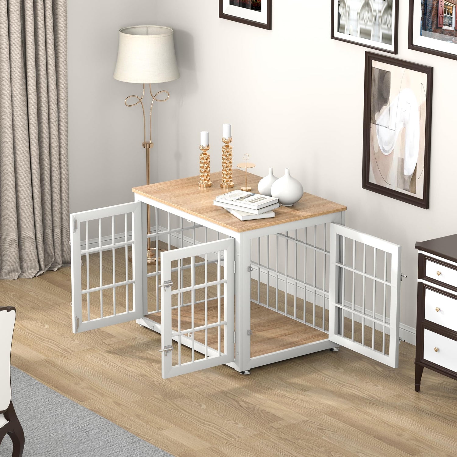 rehomerance Heavy Duty Dog Crate Furniture for Medium and Small Dogs, Decorative Pet House End Table, Wooden Cage Kennel Furniture Indoor, White and Natural