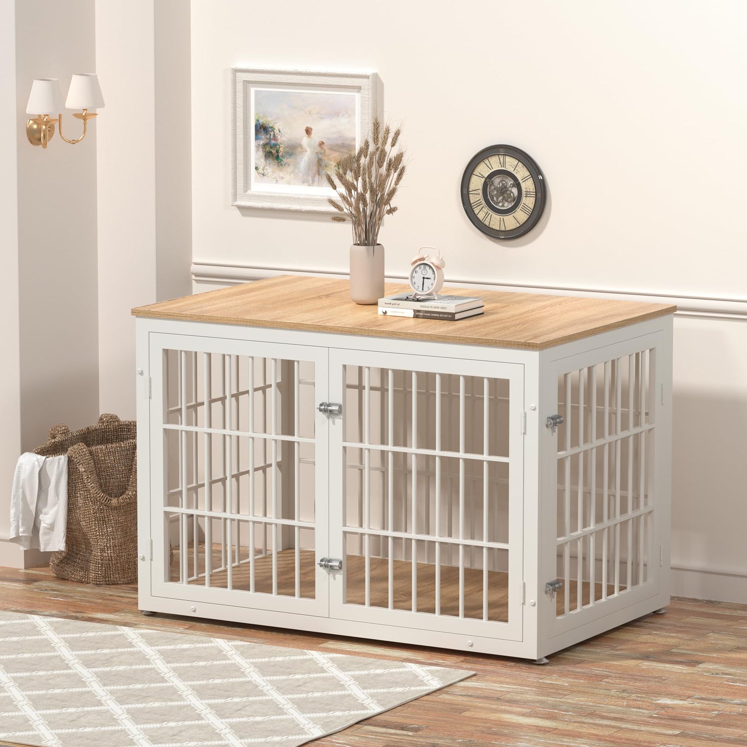 rehomerance Rustic Heavy Duty Dog Crate Furniture for Extra Large Dogs, Decorative Pet House End Table, Wooden Cage Kennel Furniture Indoor, XL, White and Natural