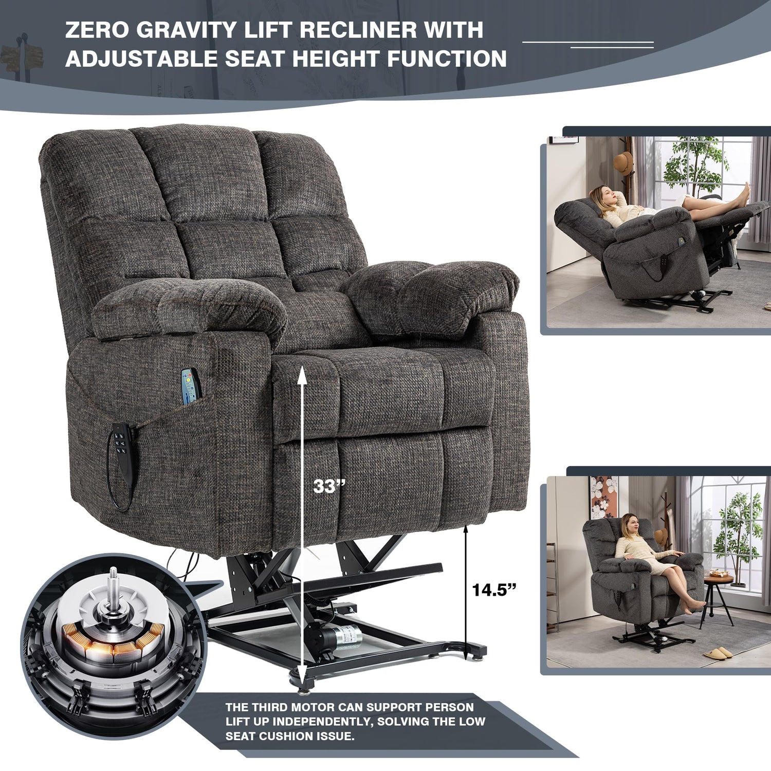 - 【Triple Motor Power Lift Recliner with Flip-Up Storage & Cup Holders】Both armrests of this zero gravity recliner include hidden storage compartments and cup holders, keeping your essentials like remotes, books, or drinks easily accessible while maintaining a clean, organized look.