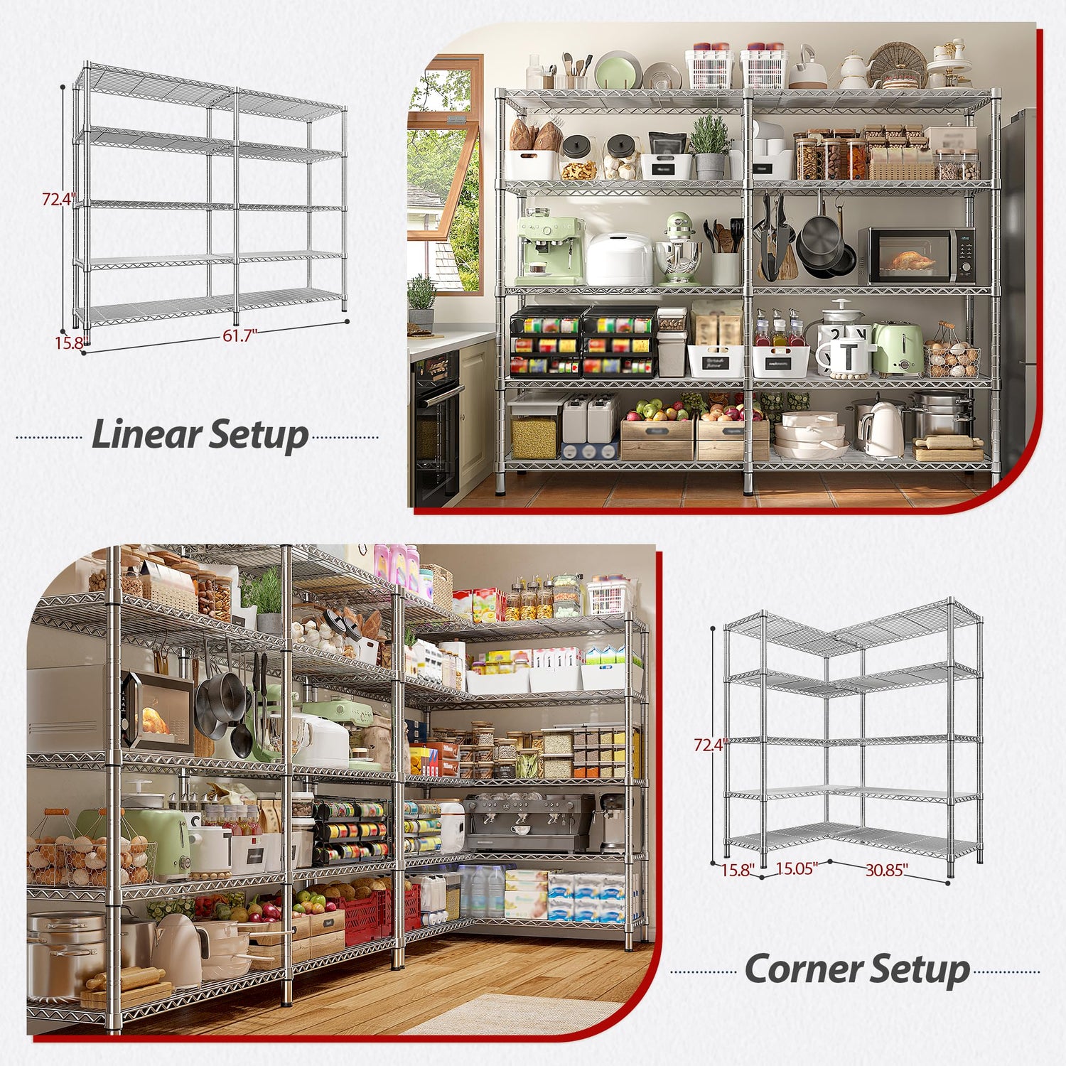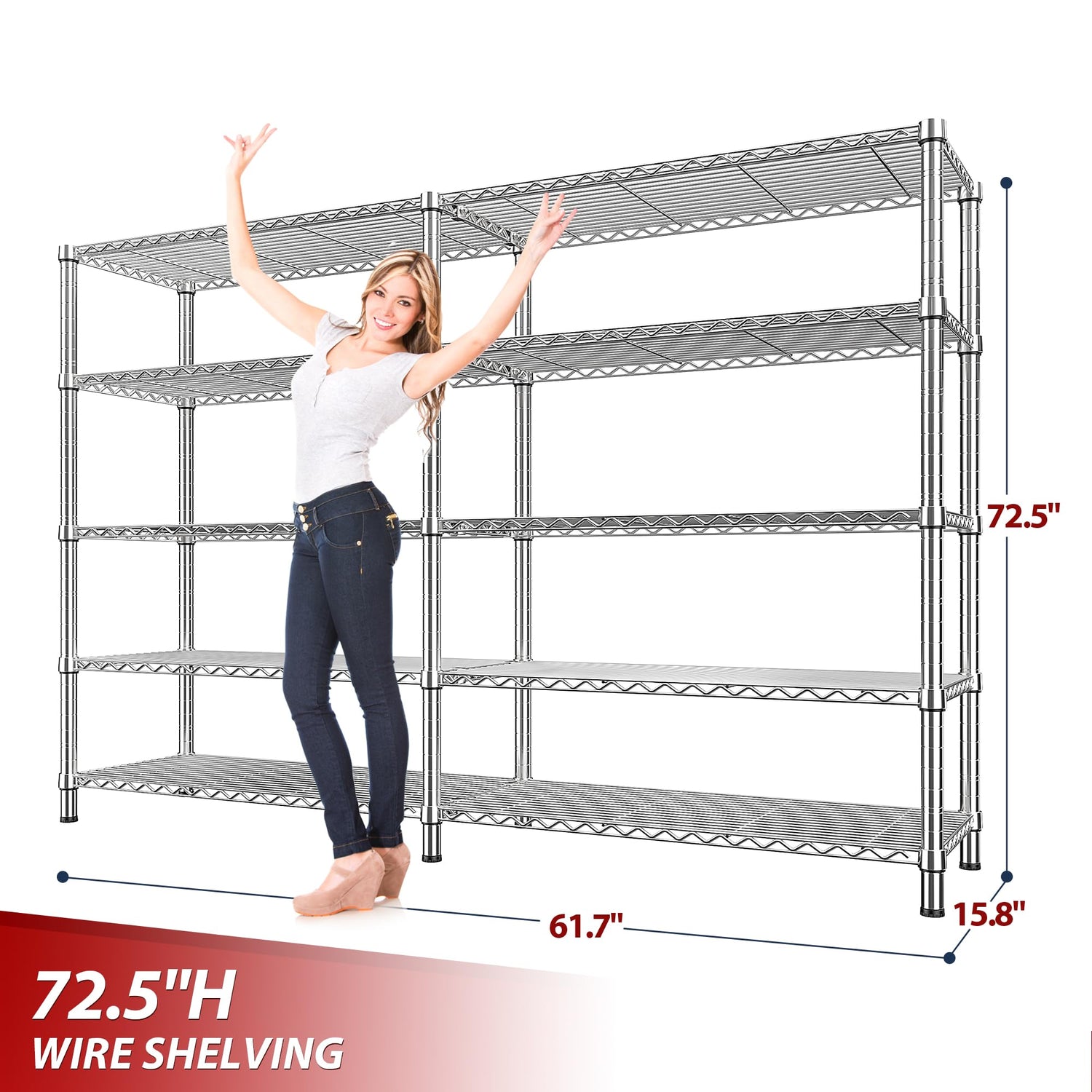 - 【61.7"W X72.4"H X 15.8"D Wire Shelving Unit】The capacity of the 61.7''W storage shelves is twice that of the market shelves, easily meeting your storage needs.This extra wide wire shelving can not only be used as a personal metal shelves for storage in your home, but also as a commercial grade heavy-duty garage shelving in warehouses ,supermarket and more.Large storage rack provide more storage space.